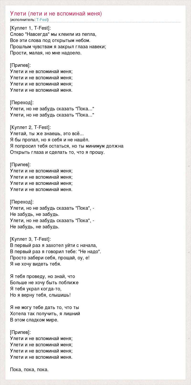[Куплет 1, T-Fest]: Слово "Навсегда" мы клеили из пепла, Все эти слова под открытым небом. Прошлым чувствам я закрыл глаза навеки; Прости, малая, но мне надоело. [Припев]: Улети и не вспоминай меня; Улети и не вспоминай меня; Улети и не вспоминай меня; Улети и не вспоминай меня. [Переход]: Улети, но не забудь сказать "Пока..." Улети, но не забудь сказать "Пока..." [Куплет 2, T-Fest]: Улетай, ты же знаешь, это всё... Я бы пропал, но я себя и не нашёл. Я попросил тебя остаться, но ты минимум должна Открыть глаза и сделать то, что я прошу. [Припев]: Улети и не вспоминай меня; Улети и не вспоминай меня; Улети и не вспоминай меня; Улети и не вспоминай меня. [Переход]: Улети, но не забудь сказать "Пока", - Не забудь, не забудь. Улети, но не забудь сказать "Пока", - Не забудь, не забудь. [Куплет 3, T-Fest]: В первый раз я захотел уйти с начала, В первый раз я говорил тебе: "Не надо". Просто забери себя, прощай, оу, е! Я не хочу видеть тебя. Я тебя проведу, но знай, что Больше не хочу быть поближе Я тебя украл когда-то, Но я верну тебя, слышишь! Я не могу тебе дать то, что ты Хотела так получить, я лишний В этом сладком мире. [Припев]: Улети и не вспоминай меня; Улети и не вспоминай меня; Улети и не вспоминай меня; Улети и не вспоминай меня. Пока, пока, пока.