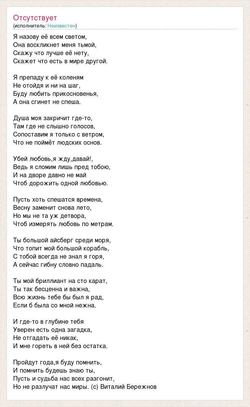 Я назову её всем светом, Она воскликнет меня тьмой, Скажу что лучше её нету, Скажет что есть в мире другой. Я препаду к её коленям Не отойдя и ни на шаг, Буду любить прикосновенья, А она сгинет не спеша. Душа моя закричит где-то, Там где не слышно голосов, Сопоставим я только с ветром, Что не поймёт людских основ. Убей любовь,я жду,давай!, Ведь я сломим лишь пред тобою, И на дворе давно не май Чтоб дорожить одной любовью. Пусть хоть спешатся времена, Весну заменит снова лето, Но мы не та уж детвора, Чтоб измерять любовь по метрам. Ты большой айсберг среди моря, Что топит мой большой корабль, С тобой всегда не знал я горя, А сейчас гибну словно падаль. Ты мой бриллиант на сто карат, Ты так бесценна и важна, Всю жизнь тебе бы был я рад, Если б была со мной нежна. И где-то в глубине тебя Уверен есть одна загадка, Не отгадать её никак, И мне гореть в ней без остатка. Пройдут года,я буду помнить, И помнить будешь знаю ты, Пусть и судьба нас всех разгонит, Но не разлучат нас миры. (с) Виталий Бережнов