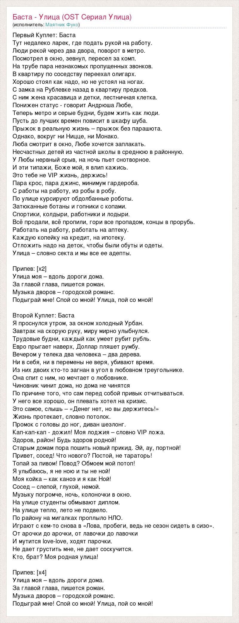 Первый Куплет: Баста Тут недалеко ларек, где подать рукой на работу. Люди рекой через два двора, поворот в метро. Посмотрел в окно, зевнул, пересел за комп. На трубе пара незнакомых пропущенных звонков. В квартиру по соседству переехал олигарх. Хорошо стоял как надо, но не устоял на ногах. С замка на Рублевке назад в квартиру предков. С ним жена красавица и детки, лестничная клетка. Понижен статус - говорит Андрюша Любе, Теперь метро и серые будни, будем жить как люди. Пусть до лучших времен повисит в шкафу шуба. Прыжок в реальную жизнь – прыжок без парашюта. Однако, вокруг ни Ницце, ни Монако. Люба смотрит в окно, Любе хочется заплакать. Несчастных детей из частной школы в среднюю в районную. У Любы нервный срыв, на ночь пьет снотворное. И эти типажи, Боже мой, я влип кажись. Это тебе не VIP жизнь, держись! Пара крос, пара джинс, минимум гардероба. С работы на работу, из робы в робу. По улице курсируют обдолбанные роботы. Затюканные ботаны и гопники с копами. Спортики, колдыри, работники и лодыри. Всё продали, всё пропили, гори все пропадом, концы в прорубь. Работать на работу, работать на аптеку. Каждую копейку на кредит, на ипотеку. Отложить надо на деток, чтобы были обуты и одеты. Улица – словно секта и мы все ее адепты. Припев: [x2] Улица моя – вдоль дороги дома. За главой глава, пишется роман. Музыка дворов – городской романс. Подыграй мне! Спой со мной! Улица, пой со мной! Второй Куплет: Баста Я проснулся утром, за окном холодный Урбан. Завтрак на скорую руку, миру мирно улыбнулся. Трудовые будни, каждый как умеет рубит рубль. Евро прыгает наверх, Доллар пляшет румбу. Вечером у телека два человека – два дерева. Ни в себя, ни в перемены не веря, убивают время. Из них двоих кто-то загнан в угол в любовном треугольнике. Она спит с ним, но мечтает о любовнике. Чиновник чинит дома, но дома не чинятся По причине того, что сам перед собой привык отчитываться. У него все хорошо, он плевать хотел на кризис. Это самое, слышь – «Денег нет, но вы держитесь!» Жизнь протекает, словно потолок. Промок с головы до ног, диван шезлонг. Кап-кап-кап - дожил! Моя лоджия – словно VIP ложа. Здоров, район! Будь здоров родной! Старым домам пора пошить новый прикид. Эй, ау, портной! Привет, сосед! Что нового? Постой, не тараторь! Топай за пивом! Повод? Обмоем мой потоп! Я улыбаюсь, я не ною и ты не ной! Моя койка – как каноэ и я как Ной! Сосед – слепой, глухой, немой. Музыку погромче, ночь, колоночки в окно. На улице студенты обмывают диплом. На улице тепло, лето не подвело. По району на мигалках проплыло НЛО. Играют с кем-то снова в «Лова, пробеги, ведь не сезон сидеть в сизо». От арочки до арочки, от лавочки до лавочки И мутится love-love, ходят парочки. Не дает грустить мне, не дает соскучится. Кто, брат? Моя родная улица! Припев: [x4] Улица моя – вдоль дороги дома. За главой глава, пишется роман. Музыка дворов – городской романс. Подыграй мне! Спой со мной! Улица, пой со мной!