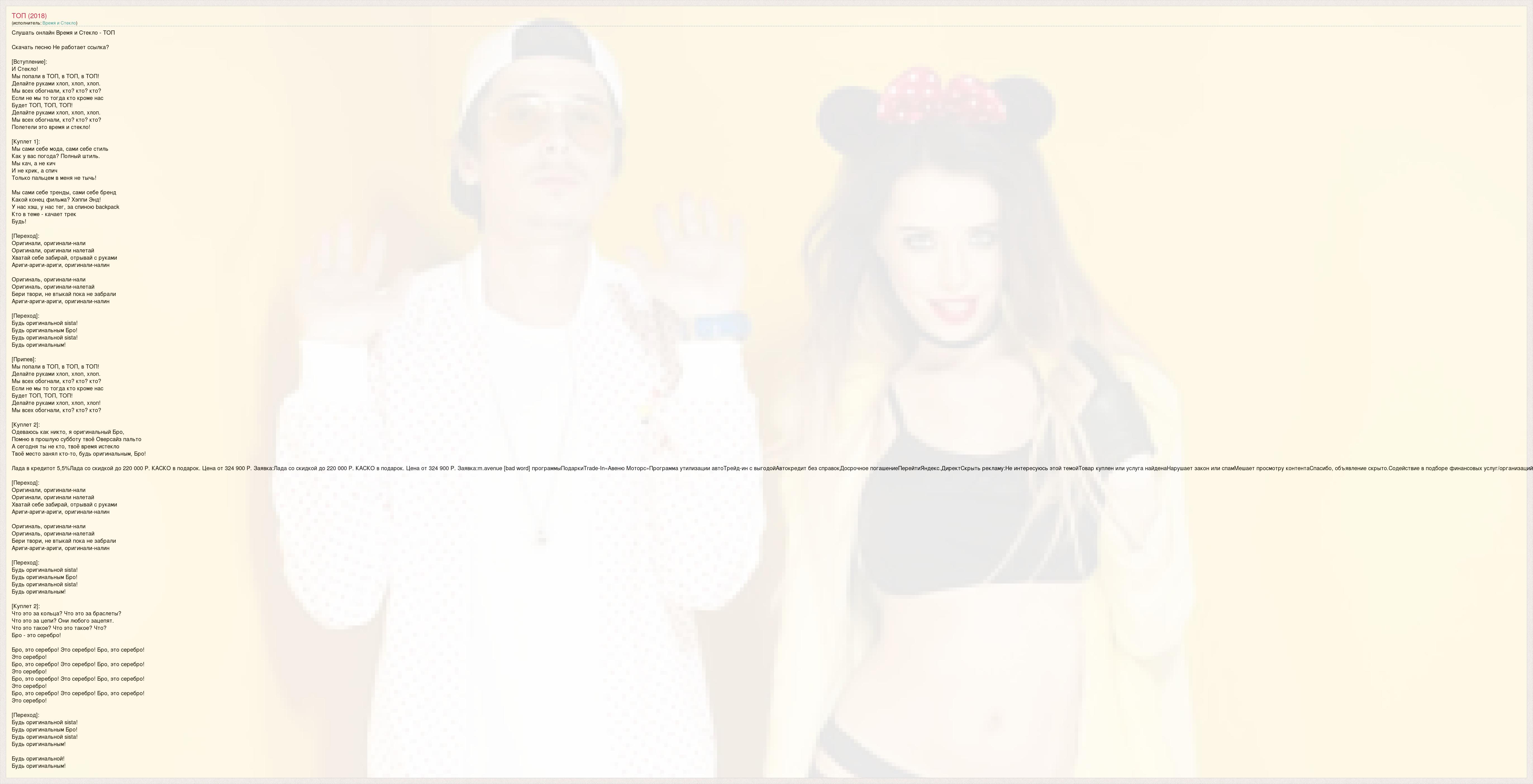 Слушать онлайн Время и Стекло - ТОП Скачать песню Не работает ссылка? [Вступление]: И Стекло! Мы попали в ТОП, в ТОП, в ТОП! Делайте руками хлоп, хлоп, хлоп. Мы всех обогнали, кто? кто? кто? Если не мы то тогда кто кроме нас Будет ТОП, ТОП, ТОП! Делайте руками хлоп, хлоп, хлоп. Мы всех обогнали, кто? кто? кто? Полетели это время и стекло! [Куплет 1]: Мы сами себе мода, сами себе стиль Как у вас погода? Полный штиль. Мы кач, а не кич И не крик, а спич Только пальцем в меня не тычь! Мы сами себе тренды, сами себе бренд Какой конец фильма? Хэппи Энд! У нас хэш, у нас тег, за спиною backpack Кто в теме - качает трек Будь! [Переход]: Оригинали, оригинали-нали Оригинали, оригинали налетай Хватай себе забирай, отрывай с руками Ариги-ариги-ариги, оригинали-налин Оригиналь, оригинали-нали Оригиналь, оригинали-налетай Бери твори, не втыкай пока не забрали Ариги-ариги-ариги, оригинали-налин [Переход]: Будь оригинальной sista! Будь оригинальным Бро! Будь оригинальной sista! Будь оригинальным! [Припев]: Мы попали в ТОП, в ТОП, в ТОП! Делайте руками хлоп, хлоп, хлоп. Мы всех обогнали, кто? кто? кто? Если не мы то тогда кто кроме нас Будет ТОП, ТОП, ТОП! Делайте руками хлоп, хлоп, хлоп! Мы всех обогнали, кто? кто? кто? [Куплет 2]: Одеваюсь как никто, я оригинальный Бро, Помню в прошлую субботу твоё Оверсайз пальто А сегодня ты не кто, твоё время истекло Твоё место занял кто-то, будь оригинальным, Бро! Лада в кредитот 5,5%Лада со скидкой до 220 000 Р. КАСКО в подарок. Цена от 324 900 Р. Заявка:Лада со скидкой до 220 000 Р. КАСКО в подарок. Цена от 324 900 Р. Заявка:m.avenue [bad word] программыПодаркиTrade-In«Авеню Моторс»Программа утилизации автоТрейд-ин с выгодойАвтокредит без справокДосрочное погашениеПерейтиЯндекс.ДиректСкрыть рекламу:Не интересуюсь этой темойТовар куплен или услуга найденаНарушает закон или спамМешает просмотру контентаСпасибо, объявление скрыто.Содействие в подборе финансовых услуг/организаций [Переход]: Оригинали, оригинали-нали Оригинали, оригинали налетай Хватай себе забирай, отрывай с руками Ариги-ариги-ариги, оригинали-налин Оригиналь, оригинали-нали Оригиналь, оригинали-налетай Бери твори, не втыкай пока не забрали Ариги-ариги-ариги, оригинали-налин [Переход]: Будь оригинальной sista! Будь оригинальным Бро! Будь оригинальной sista! Будь оригинальным! [Куплет 2]: Что это за кольца? Что это за браслеты? Что это за цепи? Они любого зацепят. Что это такое? Что это такое? Что? Бро - это серебро! Бро, это серебро! Это серебро! Бро, это серебро! Это серебро! Бро, это серебро! Это серебро! Бро, это серебро! Это серебро! Бро, это серебро! Это серебро! Бро, это серебро! Это серебро! Бро, это серебро! Это серебро! Бро, это серебро! Это серебро! [Переход]: Будь оригинальной sista! Будь оригинальным Бро! Будь оригинальной sista! Будь оригинальным! Будь оригинальной! Будь оригинальным!