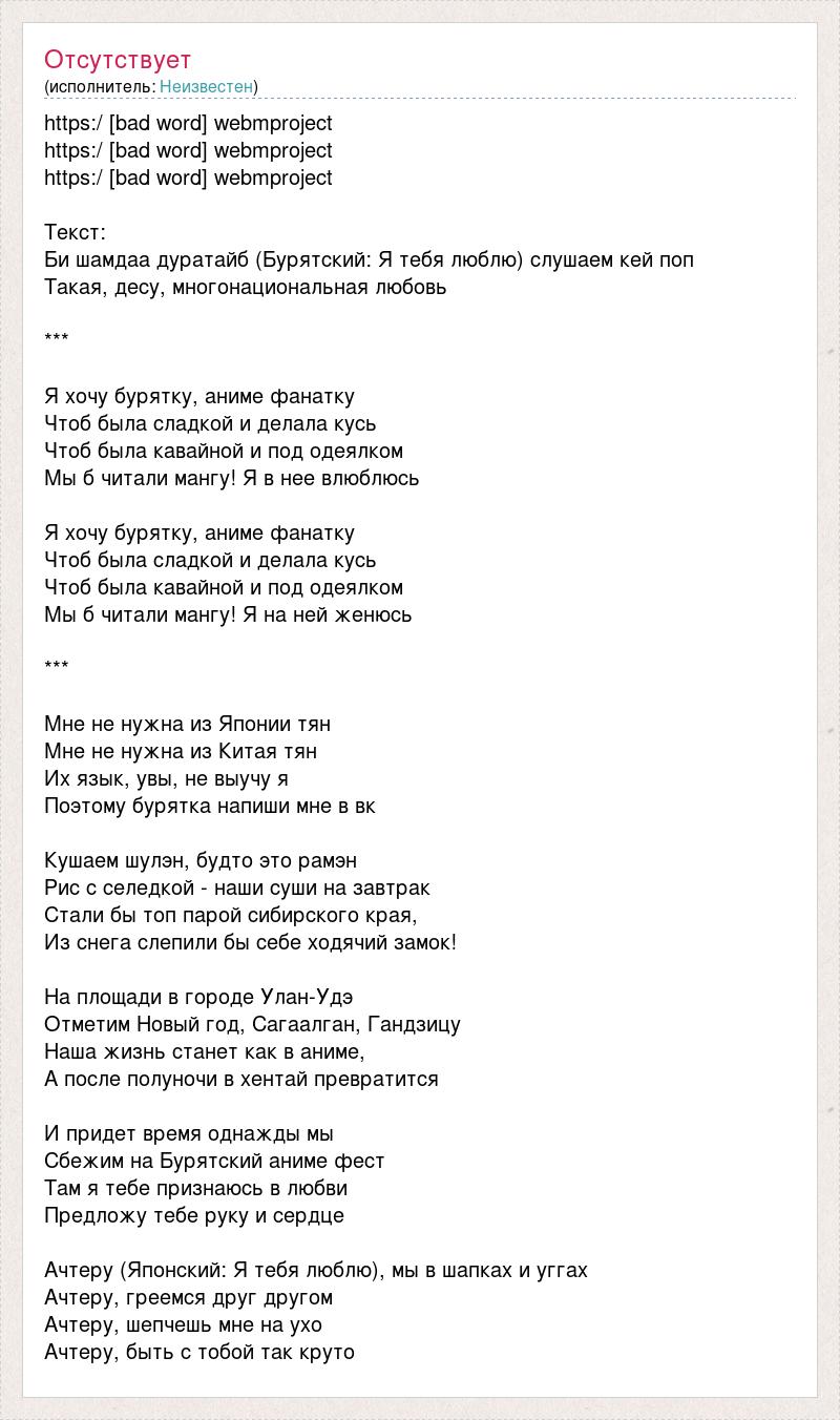 https:/ [bad word] webmproject https:/ [bad word] webmproject https:/ [bad word] webmproject Текст: Би шамдаа дуратайб (Бурятский: Я тебя люблю) слушаем кей поп Такая, десу, многонациональная любовь *** Я хочу бурятку, аниме фанатку Чтоб была сладкой и делала кусь Чтоб была кавайной и под одеялком Мы б читали мангу! Я в нее влюблюсь Я хочу бурятку, аниме фанатку Чтоб была сладкой и делала кусь Чтоб была кавайной и под одеялком Мы б читали мангу! Я на ней женюсь *** Мне не нужна из Японии тян Мне не нужна из Китая тян Их язык, увы, не выучу я Поэтому бурятка напиши мне в вк Кушаем шулэн, будто это рамэн Рис с селедкой - наши суши на завтрак Стали бы топ парой сибирского края, Из снега слепили бы себе ходячий замок! На площади в городе Улан-Удэ Отметим Новый год, Сагаалган, Гандзицу Наша жизнь станет как в аниме, А после полуночи в хентай превратится И придет время однажды мы Сбежим на Бурятский аниме фест Там я тебе признаюсь в любви Предложу тебе руку и сердце Ачтеру (Японский: Я тебя люблю), мы в шапках и уггах Ачтеру, греемся друг другом Ачтеру, шепчешь мне на ухо Ачтеру, быть с тобой так круто
