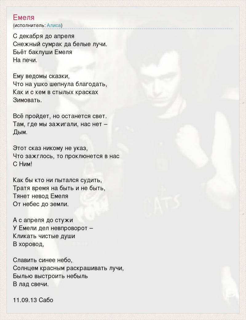 С декабря до апреля Снежный сумрак да белые лучи. Бьёт баклуши Емеля На печи. Ему ведомы сказки, Что на ушко шепнула благодать, Как и с кем в стылых красках Зимовать. Всё пройдет, но останется свет. Там, где мы зажигали, нас нет – Дым. Этот сказ никому не указ, Что зажглось, то проклюнется в нас С Ним! Как бы кто ни пытался судить, Тратя время на быть и не быть, Тянет невод Емеля От небес до земли. А с апреля до стужи У Емели дел невпроворот – Кликать чистые души В хоровод, Славить синее небо, Солнцем красным раскрашивать лучи, Былью выстроить небыль В лад свечи. 11.09.13 Сабо