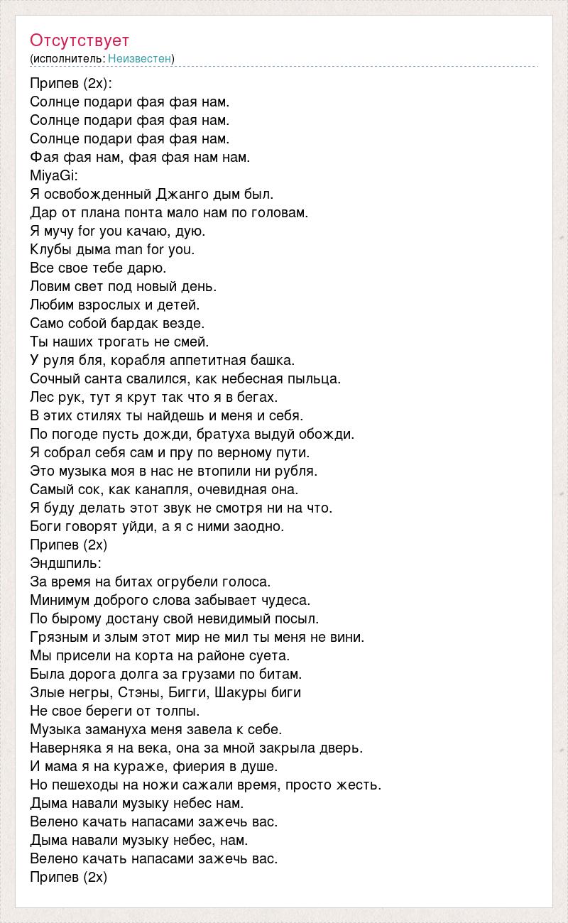 Припев (2x): Солнце подари фая фая нам. Солнце подари фая фая нам. Солнце подари фая фая нам. Фая фая нам, фая фая нам нам. MiyaGi: Я освобожденный Джанго дым был. Дар от плана понта мало нам по головам. Я мучу for you качаю, дую. Клубы дыма man for you. Все свое тебе дарю. Ловим свет под новый день. Любим взрослых и детей. Само собой бардак везде. Ты наших трогать не смей. У руля бля, корабля аппетитная башка. Сочный санта свалился, как небесная пыльца. Лес рук, тут я крут так что я в бегах. В этих стилях ты найдешь и меня и себя. По погоде пусть дожди, братуха выдуй обожди. Я собрал себя сам и пру по верному пути. Это музыка моя в нас не втопили ни рубля. Самый сок, как канапля, очевидная она. Я буду делать этот звук не смотря ни на что. Боги говорят уйди, а я с ними заодно. Припев (2x) Эндшпиль: За время на битах огрубели голоса. Минимум доброго слова забывает чудеса. По бырому достану свой невидимый посыл. Грязным и злым этот мир не мил ты меня не вини. Мы присели на корта на районе суета. Была дорога долга за грузами по битам. Злые негры, Стэны, Бигги, Шакуры биги Не свое береги от толпы. Музыка замануха меня завела к себе. Наверняка я на века, она за мной закрыла дверь. И мама я на кураже, фиерия в душе. Но пешеходы на ножи сажали время, просто жесть. Дыма навали музыку небес нам. Велено качать напасами зажечь вас. Дыма навали музыку небес, нам. Велено качать напасами зажечь вас. Припев (2x)