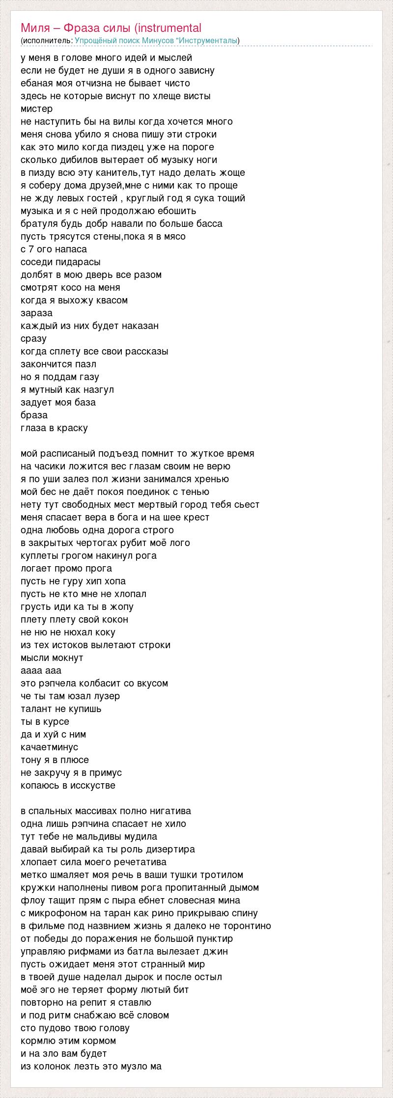 у меня в голове много идей и мыслей если не будет не души я в одного зависну ебаная моя отчизна не бывает чисто здесь не которые виснут по хлеще висты мистер не наступить бы на вилы когда хочется много меня снова убило я снова пишу эти строки как это мило когда пиздец уже на пороге сколько дибилов вытерает об музыку ноги в пизду всю эту канитель,тут надо делать жоще я соберу дома друзей,мне с ними как то проще не жду левых гостей , круглый год я сука тощий музыка и я с ней продолжаю ебошить братуля будь добр навали по больше басса пусть трясутся стены,пока я в мясо с 7 ого напаса соседи пидарасы долбят в мою дверь все разом смотрят косо на меня когда я выхожу квасом зараза каждый из них будет наказан сразу когда сплету все свои рассказы закончится пазл но я поддам газу я мутный как назгул задует моя база браза глаза в краску мой расписаный подъезд помнит то жуткое время на часики ложится вес глазам своим не верю я по уши залез пол жизни занимался хренью мой бес не даёт покоя поединок с тенью нету тут свободных мест мертвый город тебя сьест меня спасает вера в бога и на шее крест одна любовь одна дорога строго в закрытых чертогах рубит моё лого куплеты грогом накинул рога логает промо прога пусть не гуру хип хопа пусть не кто мне не хлопал грусть иди ка ты в жопу плету плету свой кокон не ню не нюхал коку из тех истоков вылетают строки мысли мокнут аааа ааа это рэпчела колбасит со вкусом че ты там юзал лузер талант не купишь ты в курсе да и хуй с ним качаетминус тону я в плюсе не закручу я в примус копаюсь в исскустве в спальных массивах полно нигатива одна лишь рэпчина спасает не хило тут тебе не мальдивы мудила давай выбирай ка ты роль дизертира хлопает сила моего речетатива метко шмаляет моя речь в ваши тушки тротилом кружки наполнены пивом рога пропитанный дымом флоу тащит прям с пыра ебнет словесная мина с микрофоном на таран как рино прикрываю спину в фильме под назвнием жизнь я далеко не торонтино от победы до поражения не большой пунктир управляю рифмами из батла вылезает джин пусть ожидает меня этот странный мир в твоей душе наделал дырок и после остыл моё эго не теряет форму лютый бит повторно на репит я ставлю и под ритм снабжаю всё словом сто пудово твою голову кормлю этим кормом и на зло вам будет из колонок лезть это музло ма