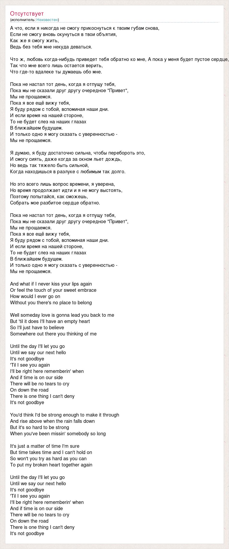 А что, если я никогда не смогу прикоснуться к твоим губам снова, Если не смогу вновь окунуться в твои объятия, Как же я смогу жить, Ведь без тебя мне некуда деваться. Что ж, любовь когда-нибудь приведет тебя обратно ко мне, А пока у меня будет пустое сердце, Так что мне всего лишь остается верить, Что где-то вдалеке ты думаешь обо мне. Пока не настал тот день, когда я отпущу тебя, Пока мы не сказали друг другу очередное "Привет", Мы не прощаемся. Пока я все ещё вижу тебя, Я буду рядом с тобой, вспоминая наши дни. И если время на нашей стороне, То не будет слез на наших глазах В ближайшем будущем. И только одно я могу сказать с уверенностью - Мы не прощаемся. Я думаю, я буду достаточно сильна, чтобы перебороть это, И смогу сиять, даже когда за окном льет дождь, Но ведь так тяжело быть сильной, Когда находишься в разлуке с любимым так долго. Но это всего лишь вопрос времени, я уверена, Но время продолжает идти и я не могу выстоять, Поэтому попытайся, как сможешь, Собрать мое разбитое сердце обратно. Пока не настал тот день, когда я отпущу тебя, Пока мы не сказали друг другу очередное "Привет", Мы не прощаемся. Пока я все ещё вижу тебя, Я буду рядом с тобой, вспоминая наши дни. И если время на нашей стороне, То не будет слез на наших глазах В ближайшем будущем. И только одно я могу сказать с уверенностью - Мы не прощаемся. And what if I never kiss your lips again Or feel the touch of your sweet embrace How would I ever go on Without you there's no place to belong Well someday love is gonna lead you back to me But 'til it does I'll have an empty heart So I'll just have to believe Somewhere out there you thinking of me Until the day I'll let you go Until we say our next hello It's not goodbye 'Til I see you again I'll be right here rememberin' when And if time is on our side There will be no tears to cry On down the road There is one thing I can't deny It's not goodbye You'd think I'd be strong enough to make it through And rise above when the rain falls down But it's so hard to be strong When you've been missin' somebody so long It's just a matter of time I'm sure But time takes time and I can't hold on So won't you try as hard as you can To put my broken heart together again Until the day I'll let you go Until we say our next hello It's not goodbye 'Til I see you again I'll be right here rememberin' when And if time is on our side There will be no tears to cry On down the road There is one thing I can't deny It's not goodbye