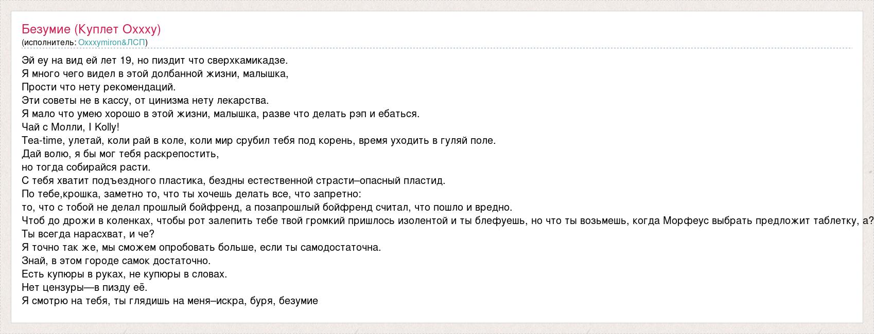 Эй еу на вид ей лет 19, но пиздит что сверхкамикадзе. Я много чего видел в этой долбанной жизни, малышка, Прости что нету рекомендаций. Эти советы не в кассу, от цинизма нету лекарства. Я мало что умею хорошо в этой жизни, малышка, разве что делать рэп и ебаться. Чай с Молли, I Kolly! Tea-time, улетай, коли рай в коле, коли мир срубил тебя под корень, время уходить в гуляй поле. Дай волю, я бы мог тебя раскрепостить, но тогда собирайся расти. С тебя хватит подъездного пластика, бездны естественной страсти–опасный пластид. По тебе,крошка, заметно то, что ты хочешь делать все, что запретно: то, что с тобой не делал прошлый бойфренд, а позапрошлый бойфренд считал, что пошло и вредно. Чтоб до дрожи в коленках, чтобы рот залепить тебе твой громкий пришлось изолентой и ты блефуешь, но что ты возьмешь, когда Морфеус выбрать предложит таблетку, а? Ты всегда нарасхват, и че? Я точно так же, мы сможем опробовать больше, если ты самодостаточна. Знай, в этом городе самок достаточно. Есть купюры в руках, не купюры в словах. Нет цензуры—в пизду её. Я смотрю на тебя, ты глядишь на меня–искра, буря, безумие