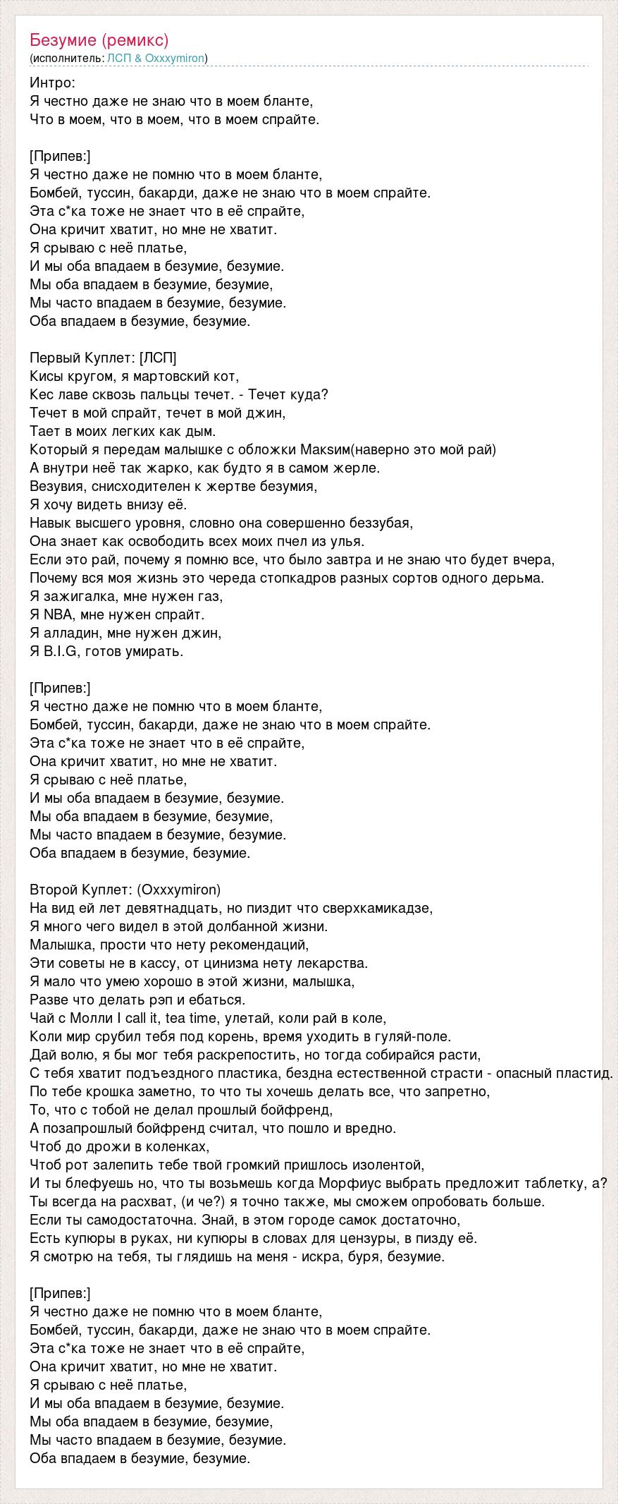 Интро: Я честно даже не знаю что в моем бланте, Что в моем, что в моем, что в моем спрайте. [Припев:] Я честно даже не помню что в моем бланте, Бомбей, туссин, бакарди, даже не знаю что в моем спрайте. Эта с*ка тоже не знает что в её спрайте, Она кричит хватит, но мне не хватит. Я срываю с неё платье, И мы оба впадаем в безумие, безумие. Мы оба впадаем в безумие, безумие, Мы часто впадаем в безумие, безумие. Оба впадаем в безумие, безумие. Первый Куплет: [ЛСП] Кисы кругом, я мартовский кот, Кес лаве сквозь пальцы течет. - Течет куда? Течет в мой спрайт, течет в мой джин, Тает в моих легких как дым. Который я передам малышке с обложки Макsим(наверно это мой рай) А внутри неё так жарко, как будто я в самом жерле. Везувия, снисходителен к жертве безумия, Я хочу видеть внизу её. Навык высшего уровня, словно она совершенно беззубая, Она знает как освободить всех моих пчел из улья. Если это рай, почему я помню все, что было завтра и не знаю что будет вчера, Почему вся моя жизнь это череда стопкадров разных сортов одного дерьма. Я зажигалка, мне нужен газ, Я NBA, мне нужен спрайт. Я алладин, мне нужен джин, Я B.I.G, готов умирать. [Припев:] Я честно даже не помню что в моем бланте, Бомбей, туссин, бакарди, даже не знаю что в моем спрайте. Эта с*ка тоже не знает что в её спрайте, Она кричит хватит, но мне не хватит. Я срываю с неё платье, И мы оба впадаем в безумие, безумие. Мы оба впадаем в безумие, безумие, Мы часто впадаем в безумие, безумие. Оба впадаем в безумие, безумие. Второй Куплет: (Oxxxymiron) На вид ей лет девятнадцать, но пиздит что сверхкамикадзе, Я много чего видел в этой долбанной жизни. Малышка, прости что нету рекомендаций, Эти советы не в кассу, от цинизма нету лекарства. Я мало что умею хорошо в этой жизни, малышка, Разве что делать рэп и ебаться. Чай с Молли I call it, tea time, улетай, коли рай в коле, Коли мир срубил тебя под корень, время уходить в гуляй-поле. Дай волю, я бы мог тебя раскрепостить, но тогда собирайся расти, С тебя хватит подъездного пластика, бездна естественной страсти - опасный пластид. По тебе крошка заметно, то что ты хочешь делать все, что запретно, То, что с тобой не делал прошлый бойфренд, А позапрошлый бойфренд считал, что пошло и вредно. Чтоб до дрожи в коленках, Чтоб рот залепить тебе твой громкий пришлось изолентой, И ты блефуешь но, что ты возьмешь когда Морфиус выбрать предложит таблетку, а? Ты всегда на расхват, (и че?) я точно также, мы сможем опробовать больше. Если ты самодостаточна. Знай, в этом городе самок достаточно, Есть купюры в руках, ни купюры в словах для цензуры, в пизду её. Я смотрю на тебя, ты глядишь на меня - искра, буря, безумие. [Припев:] Я честно даже не помню что в моем бланте, Бомбей, туссин, бакарди, даже не знаю что в моем спрайте. Эта с*ка тоже не знает что в её спрайте, Она кричит хватит, но мне не хватит. Я срываю с неё платье, И мы оба впадаем в безумие, безумие. Мы оба впадаем в безумие, безумие, Мы часто впадаем в безумие, безумие. Оба впадаем в безумие, безумие.