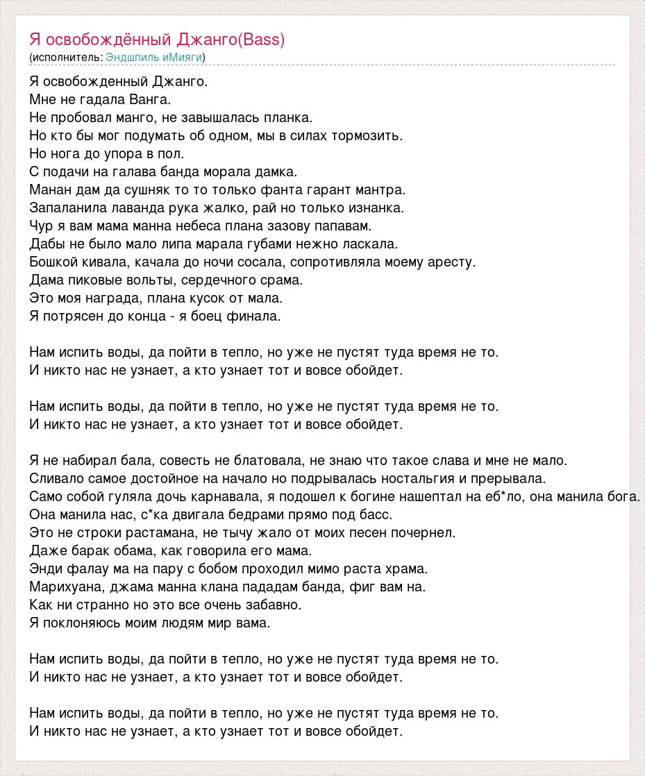 Я освобожденный Джанго. Мне не гадала Ванга. Не пробовал манго, не завышалась планка. Но кто бы мог подумать об одном, мы в силах тормозить. Но нога до упора в пол. С подачи на галава банда морала дамка. Манан дам да сушняк то то только фанта гарант мантра. Запаланила лаванда рука жалко, рай но только изнанка. Чур я вам мама манна небеса плана зазову папавам. Дабы не было мало липа марала губами нежно ласкала. Бошкой кивала, качала до ночи сосала, сопротивляла моему аресту. Дама пиковые вольты, сердечного срама. Это моя награда, плана кусок от мала. Я потрясен до конца - я боец финала. Нам испить воды, да пойти в тепло, но уже не пустят туда время не то. И никто нас не узнает, а кто узнает тот и вовсе обойдет. Нам испить воды, да пойти в тепло, но уже не пустят туда время не то. И никто нас не узнает, а кто узнает тот и вовсе обойдет. Я не набирал бала, совесть не блатовала, не знаю что такое слава и мне не мало. Сливало самое достойное на начало но подрывалась ностальгия и прерывала. Само собой гуляла дочь карнавала, я подошел к богине нашептал на еб*ло, она манила бога. Она манила нас, с*ка двигала бедрами прямо под басс. Это не строки растамана, не тычу жало от моих песен почернел. Даже барак обама, как говорила его мама. Энди фалау ма на пару с бобом проходил мимо раста храма. Марихуана, джама манна клана пададам банда, фиг вам на. Как ни странно но это все очень забавно. Я поклоняюсь моим людям мир вама. Нам испить воды, да пойти в тепло, но уже не пустят туда время не то. И никто нас не узнает, а кто узнает тот и вовсе обойдет. Нам испить воды, да пойти в тепло, но уже не пустят туда время не то. И никто нас не узнает, а кто узнает тот и вовсе обойдет.