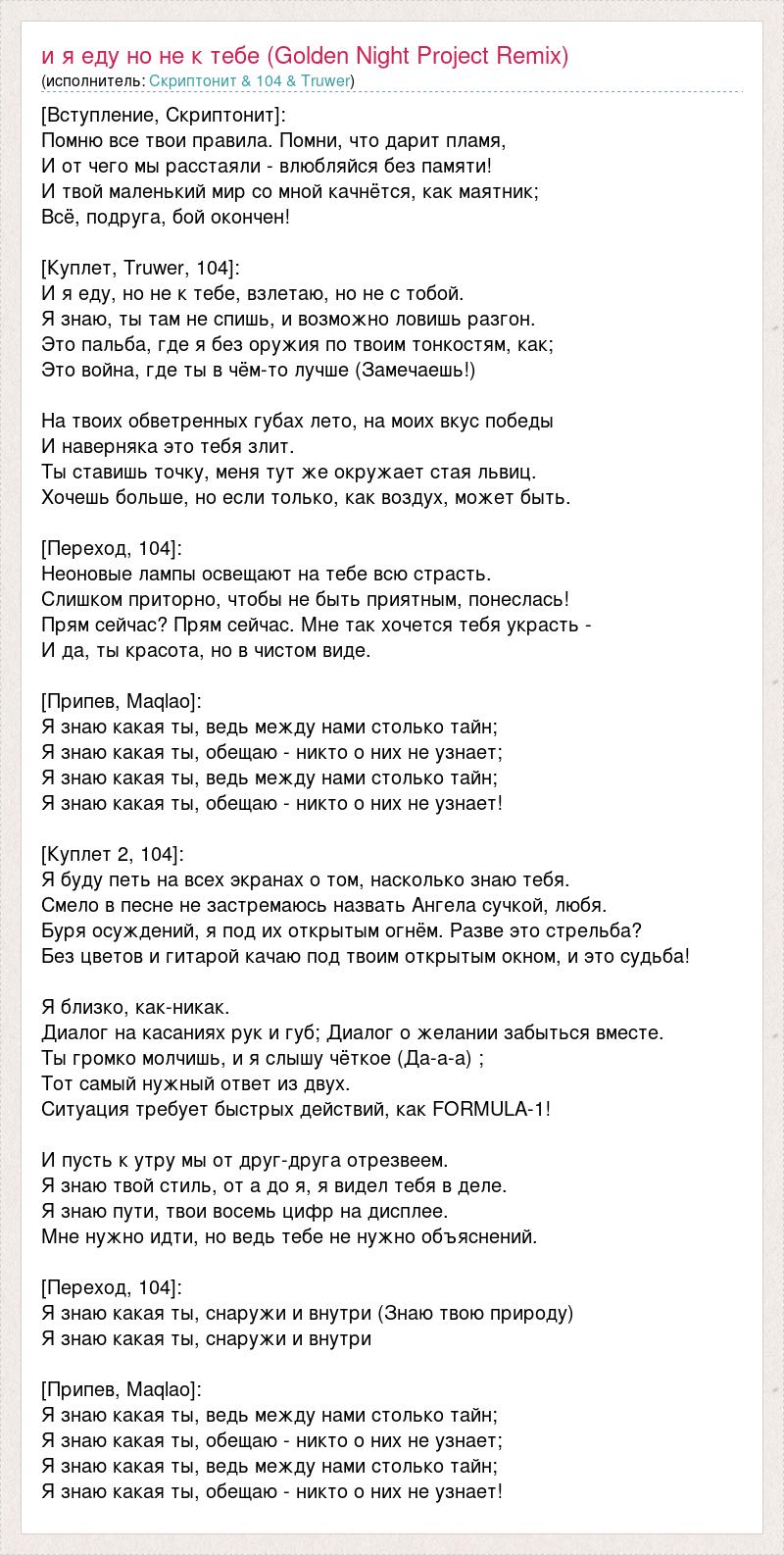 [Вступление, Скриптонит]: Помню все твои правила. Помни, что дарит пламя, И от чего мы расстаяли - влюбляйся без памяти! И твой маленький мир со мной качнётся, как маятник; Всё, подруга, бой окончен! [Куплет, Truwer, 104]: И я еду, но не к тебе, взлетаю, но не с тобой. Я знаю, ты там не спишь, и возможно ловишь разгон. Это пальба, где я без оружия по твоим тонкостям, как; Это война, где ты в чём-то лучше (Замечаешь!) На твоих обветренных губах лето, на моих вкус победы И наверняка это тебя злит. Ты ставишь точку, меня тут же окружает стая львиц. Хочешь больше, но если только, как воздух, может быть. [Переход, 104]: Неоновые лампы освещают на тебе всю страсть. Слишком приторно, чтобы не быть приятным, понеслась! Прям сейчас? Прям сейчас. Мне так хочется тебя украсть - И да, ты красота, но в чистом виде. [Припев, Maqlao]: Я знаю какая ты, ведь между нами столько тайн; Я знаю какая ты, обещаю - никто о них не узнает; Я знаю какая ты, ведь между нами столько тайн; Я знаю какая ты, обещаю - никто о них не узнает! [Куплет 2, 104]: Я буду петь на всех экранах о том, насколько знаю тебя. Смело в песне не застремаюсь назвать Ангела сучкой, любя. Буря осуждений, я под их открытым огнём. Разве это стрельба? Без цветов и гитарой качаю под твоим открытым окном, и это судьба! Я близко, как-никак. Диалог на касаниях рук и губ; Диалог о желании забыться вместе. Ты громко молчишь, и я слышу чёткое (Да-а-а) ; Тот самый нужный ответ из двух. Ситуация требует быстрых действий, как FORMULA-1! И пусть к утру мы от друг-друга отрезвеем. Я знаю твой стиль, от а до я, я видел тебя в деле. Я знаю пути, твои восемь цифр на дисплее. Мне нужно идти, но ведь тебе не нужно объяснений. [Переход, 104]: Я знаю какая ты, снаружи и внутри (Знаю твою природу) Я знаю какая ты, снаружи и внутри [Припев, Maqlao]: Я знаю какая ты, ведь между нами столько тайн; Я знаю какая ты, обещаю - никто о них не узнает; Я знаю какая ты, ведь между нами столько тайн; Я знаю какая ты, обещаю - никто о них не узнает!