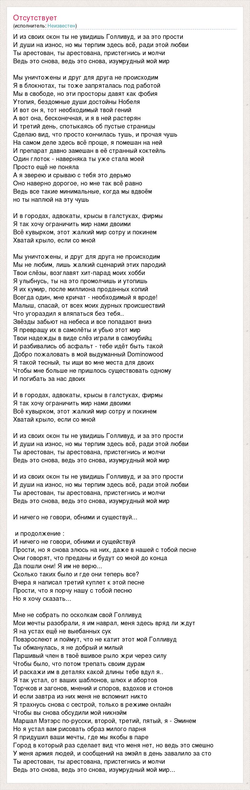 И из своих окон ты не увидишь Голливуд, и за это прости И души на износ, но мы терпим здесь всё, ради этой любви Ты арестован, ты арестована, пристегнись и молчи Ведь это снова, ведь это снова, изумрудный мой мир Мы уничтожены и друг для друга не происходим Я в блокнотах, ты тоже запряталась под работой Мы в свободе, но эти просторы давят как фобия Утопия, бездомные души достойны Нобеля И вот он я, тот необходимый твой гений А вот она, бесконечная, и я в ней растерян И третий день, спотыкаясь об пустые страницы Сделаю вид, что просто кончилась тушь, и прочая чушь На самом деле здесь всё проще, я помешан на ней И препарат давно замешан в её странный коктейль Один глоток - наверняка ты уже стала моей Просто ещё не поняла А я зверею и срываю с тебя это дерьмо Оно наверно дорогое, но мне так всё равно Ведь все такие минимальные, когда мы вдвоём но ты наплюй на эту чушь И в городах, адвокаты, крысы в галстуках, фирмы Я так хочу ограничить мир нами двоими Всё кувырком, этот жалкий мир сотру и покинем Хватай крыло, если со мной Мы уничтожены, и друг для друга не происходим Мы не любим, лишь жалкий сценарий этих пародий Твои слёзы, возглавят хит-парад моих хобби Я улыбнусь, ты на это промолчишь и утопишь Я их кумир, после миллиона проданных копий Всегда один, мне кричат - необходимый я вроде! Малыш, спасай, от всех моих дурных происшествий Что угораздил я вляпаться без тебя.. Звёзды забьют на небеса и все попадают вниз Я превращу их в самолёты и убью этот мир Твои надежды в виде слёз играли в самоубийц И разбивались об асфальт - тебе идёт быть такой Добро пожаловать в мой выдуманный Dominowood Я такой тесный, ты ищи во мне места для двоих Чтобы мне больше не пришлось существовать одному И погибать за нас двоих И в городах, адвокаты, крысы в галстуках, фирмы Я так хочу ограничить мир нами двоими Всё кувырком, этот жалкий мир сотру и покинем Хватай крыло, если со мной И из своих окон ты не увидишь Голливуд, и за это прости И души на износ, но мы терпим здесь всё, ради этой любви Ты арестован, ты арестована, пристегнись и молчи Ведь это снова, ведь это снова, изумрудный мой мир И из своих окон ты не увидишь Голливуд, и за это прости И души на износ, но мы терпим здесь всё, ради этой любви Ты арестован, ты арестована, пристегнись и молчи Ведь это снова, ведь это снова, изумрудный мой мир И ничего не говори, обними и существуй... и продолжение : И ничего не говори, обними и сущействуй Прости, но я снова злюсь на них, даже в нашей с тобой песне Они говорят, что преданы и будут со мной до конца Да пошли они! Я им не верю... Сколько таких было и где они теперь все? Вчера я написал третий куплет к этой песне Прости, что я порчу нашу с тобой песню Но я хочу сказать... Мне не собрать по осколкам свой Голливуд Мои мечты разобрали, я им наврал, меня здесь вряд ли ждут Я на устах ещё не выебанных сук Повзрослеют и поймут, что не катит этот мой Голливуд Ты обманулась, я не добрый и милый Паршивый член в твоё вшивое рыло жри через силу Чтобы было, что потом трепать своим дурам И раскажи им в деталях какой длины тебе вдул я.. Я так устал, от ваших шаблонов, шлюх и абортов Торчков и загонов, мнений и споров, вздохов и стонов И если завтра из них меня не вспомнит никто Я трахнусь снова с сестрой, только в режиме онлайн Чтобы вы снова обсудили мой никнэйм Маршал Мэтэрс по-русски, второй, третий, пятый, я - Эминем Но я устал ва