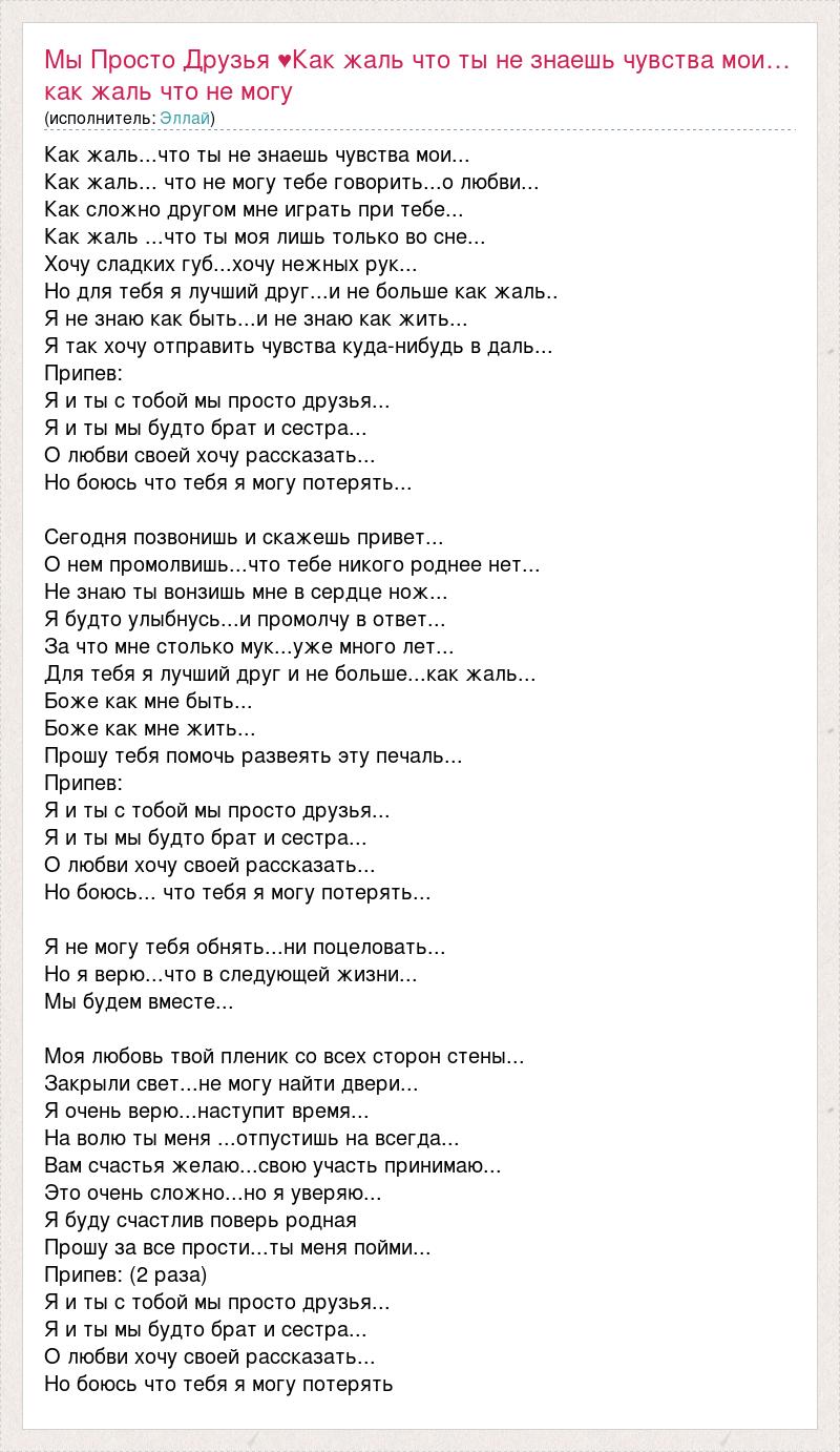 Как жаль...что ты не знаешь чувства мои... Как жаль... что не могу тебе говорить...о любви... Как сложно другом мне играть при тебе... Как жаль ...что ты моя лишь только во сне... Хочу сладких губ...хочу нежных рук... Но для тебя я лучший друг...и не больше как жаль.. Я не знаю как быть...и не знаю как жить... Я так хочу отправить чувства куда-нибудь в даль... Припев: Я и ты с тобой мы просто друзья... Я и ты мы будто брат и сестра... О любви своей хочу рассказать... Но боюсь что тебя я могу потерять... Сегодня позвонишь и скажешь привет... О нем промолвишь...что тебе никого роднее нет... Не знаю ты вонзишь мне в сердце нож... Я будто улыбнусь...и промолчу в ответ... За что мне столько мук...уже много лет... Для тебя я лучший друг и не больше...как жаль... Боже как мне быть... Боже как мне жить... Прошу тебя помочь развеять эту печаль... Припев: Я и ты с тобой мы просто друзья... Я и ты мы будто брат и сестра... О любви хочу своей рассказать... Но боюсь... что тебя я могу потерять... Я не могу тебя обнять...ни поцеловать... Но я верю...что в следующей жизни... Мы будем вместе... Моя любовь твой пленик со всех сторон стены... Закрыли свет...не могу найти двери... Я очень верю...наступит время... На волю ты меня ...отпустишь на всегда... Вам счастья желаю...свою участь принимаю... Это очень сложно...но я уверяю... Я буду счастлив поверь родная Прошу за все прости...ты меня пойми... Припев: (2 раза) Я и ты с тобой мы просто друзья... Я и ты мы будто брат и сестра... О любви хочу своей рассказать... Но боюсь что тебя я могу потерять