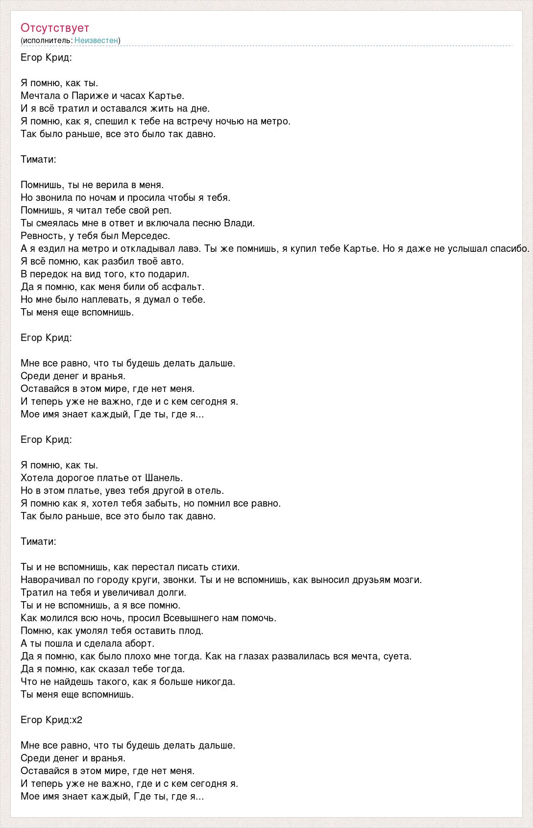 Егор Крид: Я помню, как ты. Мечтала о Париже и часах Картье. И я всё тратил и оставался жить на дне. Я помню, как я, спешил к тебе на встречу ночью на метро. Так было раньше, все это было так давно. Тимати: Помнишь, ты не верила в меня. Но звонила по ночам и просила чтобы я тебя. Помнишь, я читал тебе свой реп. Ты смеялась мне в ответ и включала песню Влади. Ревность, у тебя был Мерседес. А я ездил на метро и откладывал лавэ. Ты же помнишь, я купил тебе Картье. Но я даже не услышал спасибо. Я всё помню, как разбил твоё авто. В передок на вид того, кто подарил. Да я помню, как меня били об асфальт. Но мне было наплевать, я думал о тебе. Ты меня еще вспомнишь. Егор Крид: Мне все равно, что ты будешь делать дальше. Среди денег и вранья. Оставайся в этом мире, где нет меня. И теперь уже не важно, где и с кем сегодня я. Мое имя знает каждый, Где ты, где я... Егор Крид: Я помню, как ты. Хотела дорогое платье от Шанель. Но в этом платье, увез тебя другой в отель. Я помню как я, хотел тебя забыть, но помнил все равно. Так было раньше, все это было так давно. Тимати: Ты и не вспомнишь, как перестал писать стихи. Наворачивал по городу круги, звонки. Ты и не вспомнишь, как выносил друзьям мозги. Тратил на тебя и увеличивал долги. Ты и не вспомнишь, а я все помню. Как молился всю ночь, просил Всевышнего нам помочь. Помню, как умолял тебя оставить плод. А ты пошла и сделала аборт. Да я помню, как было плохо мне тогда. Как на глазах развалилась вся мечта, суета. Да я помню, как сказал тебе тогда. Что не найдешь такого, как я больше никогда. Ты меня еще вспомнишь. Егор Крид:х2 Мне все равно, что ты будешь делать дальше. Среди денег и вранья. Оставайся в этом мире, где нет меня. И теперь уже не важно, где и с кем сегодня я. Мое имя знает каждый, Где ты, где я...