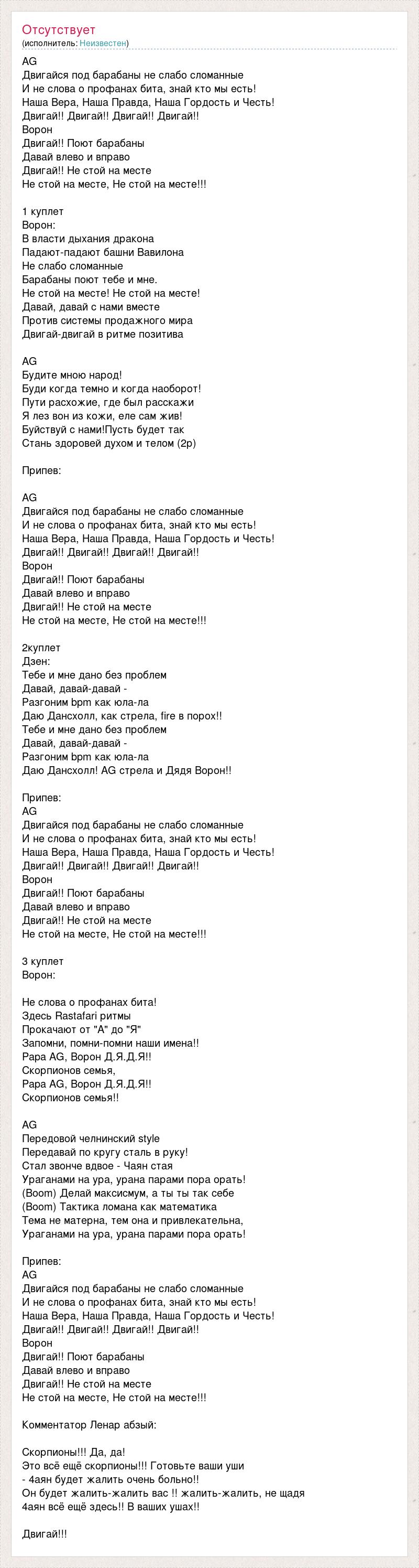 AG Двигайся под барабаны не слабо сломанные И не слова о профанах бита, знай кто мы есть! Наша Вера, Наша Правда, Наша Гордость и Честь! Двигай!! Двигай!! Двигай!! Двигай!! Ворон Двигай!! Поют барабаны Давай влево и вправо Двигай!! Не стой на месте Не стой на месте, Не стой на месте!!! 1 куплет Ворон: В власти дыхания дракона Падают-падают башни Вавилона Не слабо сломанные Барабаны поют тебе и мне. Не стой на месте! Не стой на месте! Давай, давай с нами вместе Против системы продажного мира Двигай-двигай в ритме позитива AG Будите мною народ! Буди когда темно и когда наоборот! Пути расхожие, где был расскажи Я лез вон из кожи, еле сам жив! Буйствуй с нами!Пусть будет так Стань здоровей духом и телом (2р) Припев: AG Двигайся под барабаны не слабо сломанные И не слова о профанах бита, знай кто мы есть! Наша Вера, Наша Правда, Наша Гордость и Честь! Двигай!! Двигай!! Двигай!! Двигай!! Ворон Двигай!! Поют барабаны Давай влево и вправо Двигай!! Не стой на месте Не стой на месте, Не стой на месте!!! 2куплет Дзен: Тебе и мне дано без проблем Давай, давай-давай - Разгоним bpm как юла-ла Даю Дансхолл, как стрела, fire в порох!! Тебе и мне дано без проблем Давай, давай-давай - Разгоним bpm как юла-ла Даю Дансхолл! AG стрела и Дядя Ворон!! Припев: AG Двигайся под барабаны не слабо сломанные И не слова о профанах бита, знай кто мы есть! Наша Вера, Наша Правда, Наша Гордость и Честь! Двигай!! Двигай!! Двигай!! Двигай!! Ворон Двигай!! Поют барабаны Давай влево и вправо Двигай!! Не стой на месте Не стой на месте, Не стой на месте!!! 3 куплет Ворон: Не слова о профанах бита! Здесь Rastafari ритмы Прокачают от "А" до "Я" Запомни, помни-помни наши имена!! Papa AG, Ворон Д.Я.Д.Я!! Скорпионов семья, Papa AG, Ворон Д.Я.Д.Я!! Скорпионов семья!! AG Передовой челнинский style Передавай по кругу сталь в руку! Стал звонче вдвое - Чаян стая Ураганами на ура, урана парами пора орать! (Boom) Делай максисмум, а ты ты так себе (Boom) Тактика ломана как математика Тема не матерна, тем она и привлекательна, Ураганами на ура, урана парами пора орать! Припев: AG Двигайся под барабаны не слабо сломанные И не слова о профанах бита, знай кто мы есть! Наша Вера, Наша Правда, Наша Гордость и Честь! Двигай!! Двигай!! Двигай!! Двигай!! Ворон Двигай!! Поют барабаны Давай влево и вправо Двигай!! Не стой на месте Не стой на месте, Не стой на месте!!! Комментатор Ленар абзый: Скорпионы!!! Да, да! Это всё ещё скорпионы!!! Готовьте ваши уши - 4аян будет жалить очень больно!! Он будет жалить-жалить вас !! жалить-жалить, не щадя 4аян всё ещё здесь!! В ваших ушах!! Двигай!!!