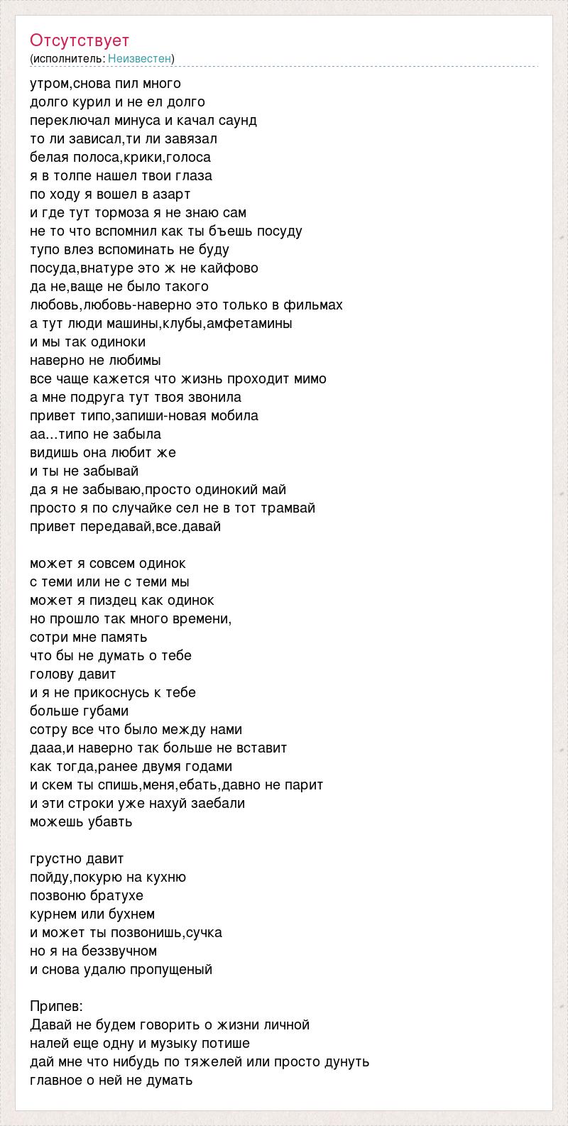 утром,снова пил много долго курил и не ел долго переключал минуса и качал саунд то ли зависал,ти ли завязал белая полоса,крики,голоса я в толпе нашел твои глаза по ходу я вошел в азарт и где тут тормоза я не знаю сам не то что вспомнил как ты бъешь посуду тупо влез вспоминать не буду посуда,внатуре это ж не кайфово да не,ваще не было такого любовь,любовь-наверно это только в фильмах а тут люди машины,клубы,амфетамины и мы так одиноки наверно не любимы все чаще кажется что жизнь проходит мимо а мне подруга тут твоя звонила привет типо,запиши-новая мобила аа...типо не забыла видишь она любит же и ты не забывай да я не забываю,просто одинокий май просто я по случайке сел не в тот трамвай привет передавай,все.давай может я совсем одинок с теми или не с теми мы может я пиздец как одинок но прошло так много времени, сотри мне память что бы не думать о тебе голову давит и я не прикоснусь к тебе больше губами сотру все что было между нами дааа,и наверно так больше не вставит как тогда,ранее двумя годами и скем ты спишь,меня,ебать,давно не парит и эти строки уже нахуй заебали можешь убавть грустно давит пойду,покурю на кухню позвоню братухе курнем или бухнем и может ты позвонишь,сучка но я на беззвучном и снова удалю пропущеный Припев: Давай не будем говорить о жизни личной налей еще одну и музыку потише дай мне что нибудь по тяжелей или просто дунуть главное о ней не думать