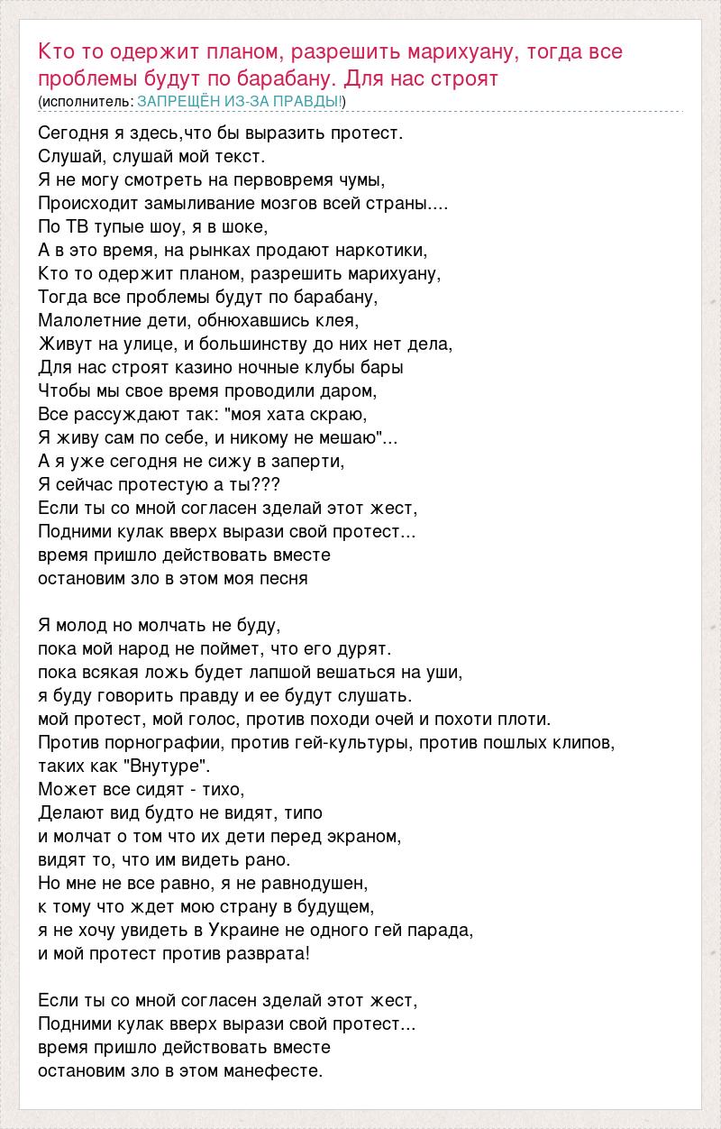 Сегодня я здесь,что бы выразить протест. Слушай, слушай мой текст. Я не могу смотреть на первовремя чумы, Происходит замыливание мозгов всей страны.... По ТВ тупые шоу, я в шоке, А в это время, на рынках продают наркотики, Кто то одержит планом, разрешить марихуану, Тогда все проблемы будут по барабану, Малолетние дети, обнюхавшись клея, Живут на улице, и большинству до них нет дела, Для нас строят казино ночные клубы бары Чтобы мы свое время проводили даром, Все рассуждают так: "моя хата скраю, Я живу сам по себе, и никому не мешаю"... А я уже сегодня не сижу в заперти, Я сейчас протестую а ты??? Если ты со мной согласен зделай этот жест, Подними кулак вверх вырази свой протест... время пришло действовать вместе остановим зло в этом моя песня Я молод но молчать не буду, пока мой народ не поймет, что его дурят. пока всякая ложь будет лапшой вешаться на уши, я буду говорить правду и ее будут слушать. мой протест, мой голос, против походи очей и похоти плоти. Против порнографии, против гей-культуры, против пошлых клипов, таких как "Внутуре". Может все сидят - тихо, Делают вид будто не видят, типо и молчат о том что их дети перед экраном, видят то, что им видеть рано. Но мне не все равно, я не равнодушен, к тому что ждет мою страну в будущем, я не хочу увидеть в Украине не одного гей парада, и мой протест против разврата! Если ты со мной согласен зделай этот жест, Подними кулак вверх вырази свой протест... время пришло действовать вместе остановим зло в этом манефесте.