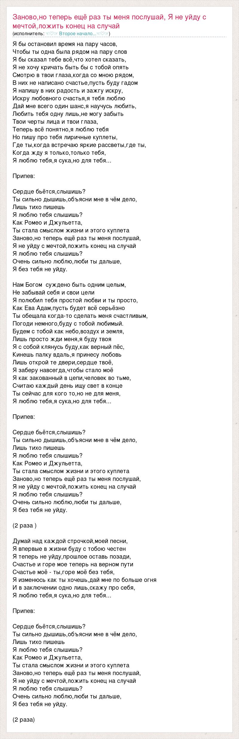 Я бы остановил время на пару часов, Чтобы ты одна была рядом на пару слов Я бы сказал тебе всё,что хотел сказать, Я не хочу кричать быть бы с тобой опять Смотрю в твои глаза,когда со мною рядом, В них не написано счастье,пусть буду гадом Я напишу в них радость и зажгу искру, Искру любовного счастья,я тебя люблю Дай мне всего один шанс,я научусь любить, Любить тебя одну лишь,не могу забыть Твои черты лица и твои глаза, Теперь всё понятно,я люблю тебя Но пишу про тебя лиричные куплеты, Где ты,когда встречаю яркие рассветы,где ты, Когда жду я только,только тебя, Я люблю тебя,я сука,но для тебя... Припев: Сердце бьётся,слышишь? Ты сильно дышишь,объясни мне в чём дело, Лишь тихо пишешь Я люблю тебя слышишь? Как Ромео и Джульетта, Ты стала смыслом жизни и этого куплета Заново,но теперь ещё раз ты меня послушай, Я не уйду с мечтой,ложить конец на случай Я люблю тебя слышишь? Очень сильно люблю,люби ты дальше, Я без тебя не уйду. Нам Богом суждено быть одним целым, Не забывай себя и свои цели Я полюбил тебя простой любви и ты просто, Как Ева Адам,пусть будет всё серьёзно Ты обещала когда-то сделать меня счастливым, Погоди немного,буду с тобой любимый. Будем с тобой как небо,воздух и земля, Лишь просто жди меня,я буду твоя Я с собой клянусь буду,как верный пёс, Кинешь палку вдаль,я принесу любовь Лишь открой те двери,сердце твоё, Я заберу навсегда,чтобы стало моё Я как закованный в цепи,человек во тьме, Считаю каждый день ищу свет в конце Ты сейчас для кого то,но не для меня, Я люблю тебя,я сука,но для тебя... Припев: Сердце бьётся,слышишь? Ты сильно дышишь,объясни мне в чём дело, Лишь тихо пишешь Я люблю тебя слышишь? Как Ромео и Джульетта, Ты стала смыслом жизни и этого куплета Заново,но теперь ещё раз ты меня послушай, Я не уйду с мечтой,ложить конец на случай Я люблю тебя слышишь? Очень сильно люблю,люби ты дальше, Я без тебя не уйду. (2 раза ) Думай над каждой строчкой,моей песни, Я впервые в жизни буду с тобою честен Я теперь не уйду,прошлое оставь позади, Счастье и горе мое теперь на верном пути Счастье моё - ты,горе моё без тебя, Я изменюсь как ты хочешь,дай мне по больше огня И в заключении одно лишь,скажу про себя, Я люблю тебя,я сука,но для тебя... Припев: Сердце бьётся,слышишь? Ты сильно дышишь,объясни мне в чём дело, Лишь тихо пишешь Я люблю тебя слышишь? Как Ромео и Джульетта, Ты стала смыслом жизни и этого куплета Заново,но теперь ещё раз ты меня послушай, Я не уйду с мечтой,ложить конец на случай Я люблю тебя слышишь? Очень сильно люблю,люби ты дальше, Я без тебя не уйду. (2 раза)