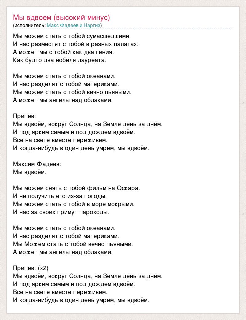 Мы можем стать с тобой сумасшедшими. И нас разместят с тобой в разных палатах. А может мы с тобой как два гения. Как будто два нобеля лауреата. Мы можем стать с тобой океанами. И нас разделят с тобой материками. Мы можем стать с тобой вечно пьяными. А может мы ангелы над облаками. Припев: Мы вдвоём, вокруг Солнца, на Земле день за днём. И под ярким самым и под дождем вдвоём. Все на свете вместе переживем. И когда-нибудь в один день умрем, мы вдвоём. Максим Фадеев: Мы вдвоём. Мы можем снять с тобой фильм на Оскара. И не получить его из-за погоды. Мы можем стать с тобой в море мокрыми. И нас за своих примут пароходы. Мы можем стать с тобой океанами. И нас разделят с тобой материками. Мы Можем стать с тобой вечно пьяными. А может мы ангелы над облаками. Припев: (х2) Мы вдвоём, вокруг Солнца, на Земле день за днём. И под ярким самым и под дождем вдвоём. Все на свете вместе переживем. И когда-нибудь в один день умрем, мы вдвоём.