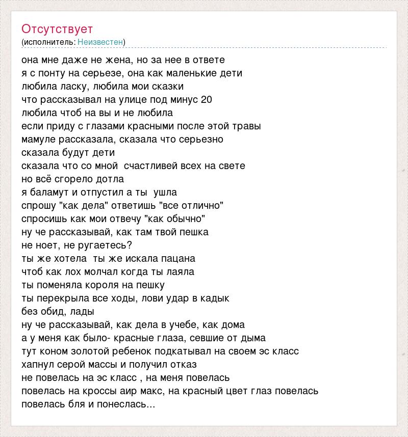 она мне даже не жена, но за нее в ответе я с понту на серьезе, она как маленькие дети любила ласку, любила мои сказки что рассказывал на улице под минус 20 любила чтоб на вы и не любила если приду с глазами красными после этой травы мамуле рассказала, сказала что серьезно сказала будут дети сказала что со мной счастливей всех на свете но всё сгорело дотла я баламут и отпустил а ты ушла спрошу "как дела" ответишь "все отлично" спросишь как мои отвечу "как обычно" ну че рассказывай, как там твой пешка не ноет, не ругаетесь? ты же хотела ты же искала пацана чтоб как лох молчал когда ты лаяла ты поменяла короля на пешку ты перекрыла все ходы, лови удар в кадык без обид, лады ну че рассказывай, как дела в учебе, как дома а у меня как было- красные глаза, севшие от дыма тут коном золотой ребенок подкатывал на своем эс класс хапнул серой массы и получил отказ не повелась на эс класс , на меня повелась повелась на кроссы аир макс, на красный цвет глаз повелась повелась бля и понеслась...