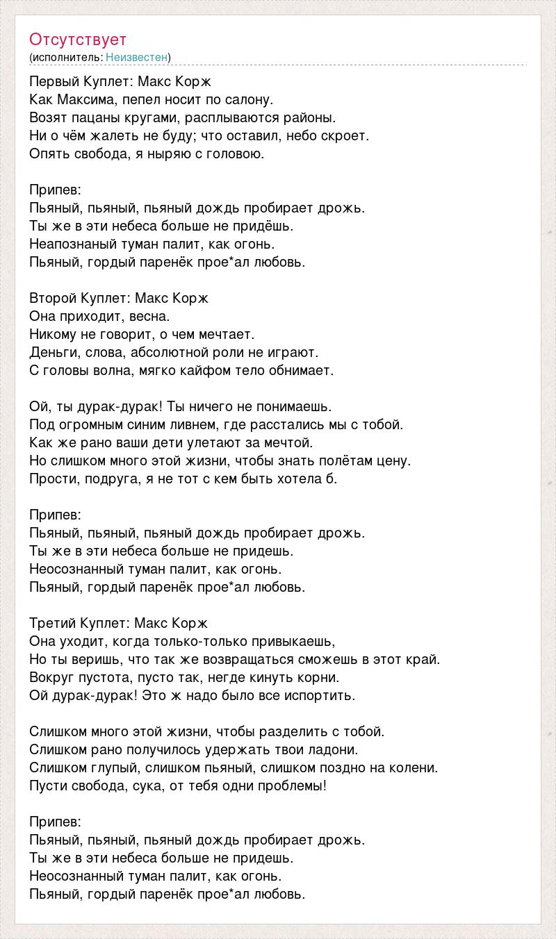 Первый Куплет: Макс Корж Как Максима, пепел носит по салону. Возят пацаны кругами, расплываются районы. Ни о чём жалеть не буду; что оставил, небо скроет. Опять свобода, я ныряю с головою. Припев: Пьяный, пьяный, пьяный дождь пробирает дрожь. Ты же в эти небеса больше не придёшь. Неапознаный туман палит, как огонь. Пьяный, гордый паренёк прое*ал любовь. Второй Куплет: Макс Корж Она приходит, весна. Никому не говорит, о чем мечтает. Деньги, слова, абсолютной роли не играют. С головы волна, мягко кайфом тело обнимает. Ой, ты дурак-дурак! Ты ничего не понимаешь. Под огромным синим ливнем, где расстались мы с тобой. Как же рано ваши дети улетают за мечтой. Но слишком много этой жизни, чтобы знать полётам цену. Прости, подруга, я не тот с кем быть хотела б. Припев: Пьяный, пьяный, пьяный дождь пробирает дрожь. Ты же в эти небеса больше не придешь. Неосознанный туман палит, как огонь. Пьяный, гордый паренёк прое*ал любовь. Третий Куплет: Макс Корж Она уходит, когда только-только привыкаешь, Но ты веришь, что так же возвращаться сможешь в этот край. Вокруг пустота, пусто так, негде кинуть корни. Ой дурак-дурак! Это ж надо было все испортить. Слишком много этой жизни, чтобы разделить с тобой. Слишком рано получилось удержать твои ладони. Слишком глупый, слишком пьяный, слишком поздно на колени. Пусти свобода, сука, от тебя одни проблемы! Припев: Пьяный, пьяный, пьяный дождь пробирает дрожь. Ты же в эти небеса больше не придешь. Неосознанный туман палит, как огонь. Пьяный, гордый паренёк прое*ал любовь.