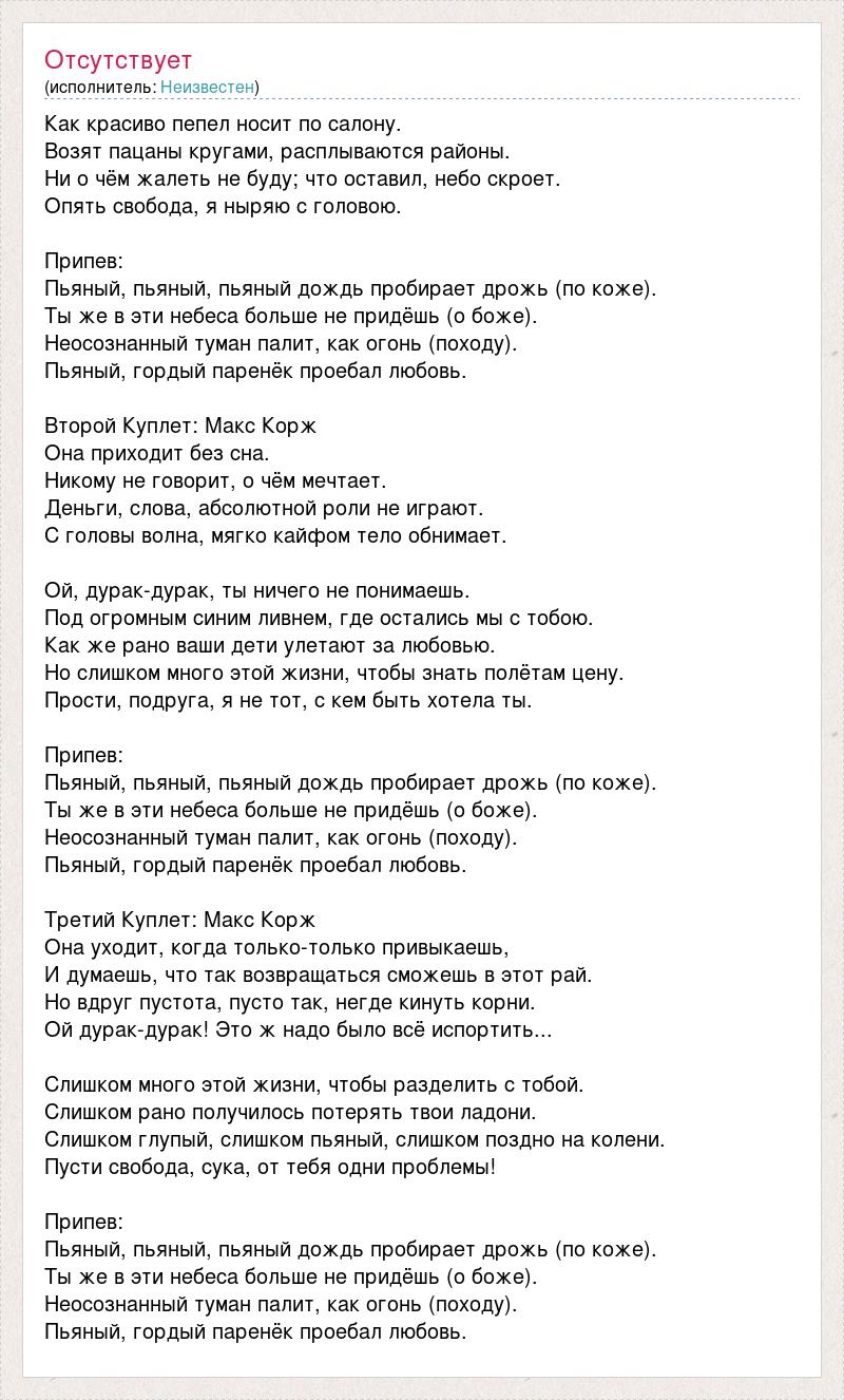 Как красиво пепел носит по салону. Возят пацаны кругами, расплываются районы. Ни о чём жалеть не буду; что оставил, небо скроет. Опять свобода, я ныряю с головою. Припев: Пьяный, пьяный, пьяный дождь пробирает дрожь (по коже). Ты же в эти небеса больше не придёшь (о боже). Неосознанный туман палит, как огонь (походу). Пьяный, гордый паренёк проебал любовь. Второй Куплет: Макс Корж Она приходит без сна. Никому не говорит, о чём мечтает. Деньги, слова, абсолютной роли не играют. С головы волна, мягко кайфом тело обнимает. Ой, дурак-дурак, ты ничего не понимаешь. Под огромным синим ливнем, где остались мы с тобою. Как же рано ваши дети улетают за любовью. Но слишком много этой жизни, чтобы знать полётам цену. Прости, подруга, я не тот, с кем быть хотела ты. Припев: Пьяный, пьяный, пьяный дождь пробирает дрожь (по коже). Ты же в эти небеса больше не придёшь (о боже). Неосознанный туман палит, как огонь (походу). Пьяный, гордый паренёк проебал любовь. Третий Куплет: Макс Корж Она уходит, когда только-только привыкаешь, И думаешь, что так возвращаться сможешь в этот рай. Но вдруг пустота, пусто так, негде кинуть корни. Ой дурак-дурак! Это ж надо было всё испортить... Слишком много этой жизни, чтобы разделить с тобой. Слишком рано получилось потерять твои ладони. Слишком глупый, слишком пьяный, слишком поздно на колени. Пусти свобода, сука, от тебя одни проблемы! Припев: Пьяный, пьяный, пьяный дождь пробирает дрожь (по коже). Ты же в эти небеса больше не придёшь (о боже). Неосознанный туман палит, как огонь (походу). Пьяный, гордый паренёк проебал любовь.