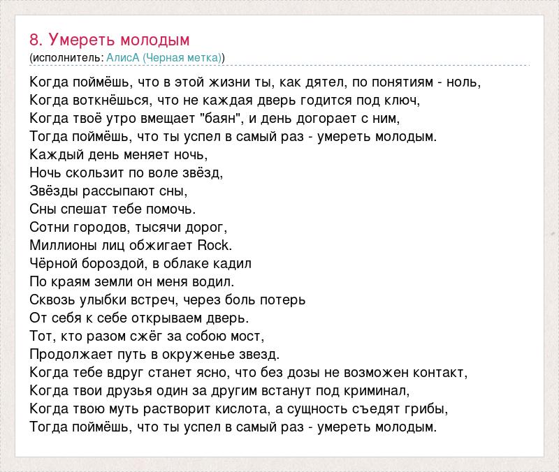 Когда поймёшь, что в этой жизни ты, как дятел, по понятиям - ноль, Когда воткнёшься, что не каждая дверь годится под ключ, Когда твоё утро вмещает "баян", и день догорает с ним, Тогда поймёшь, что ты успел в самый раз - умереть молодым. Каждый день меняет ночь, Ночь скользит по воле звёзд, Звёзды рассыпают сны, Сны спешат тебе помочь. Сотни городов, тысячи дорог, Миллионы лиц обжигает Rock. Чёрной бороздой, в облаке кадил По краям земли он меня водил. Сквозь улыбки встреч, через боль потерь От себя к себе открываем дверь. Тот, кто разом сжёг за собою мост, Продолжает путь в окруженье звезд. Когда тебе вдруг станет ясно, что без дозы не возможен контакт, Когда твои друзья один за другим встанут под криминал, Когда твою муть растворит кислота, а сущность съедят грибы, Тогда поймёшь, что ты успел в самый раз - умереть молодым.