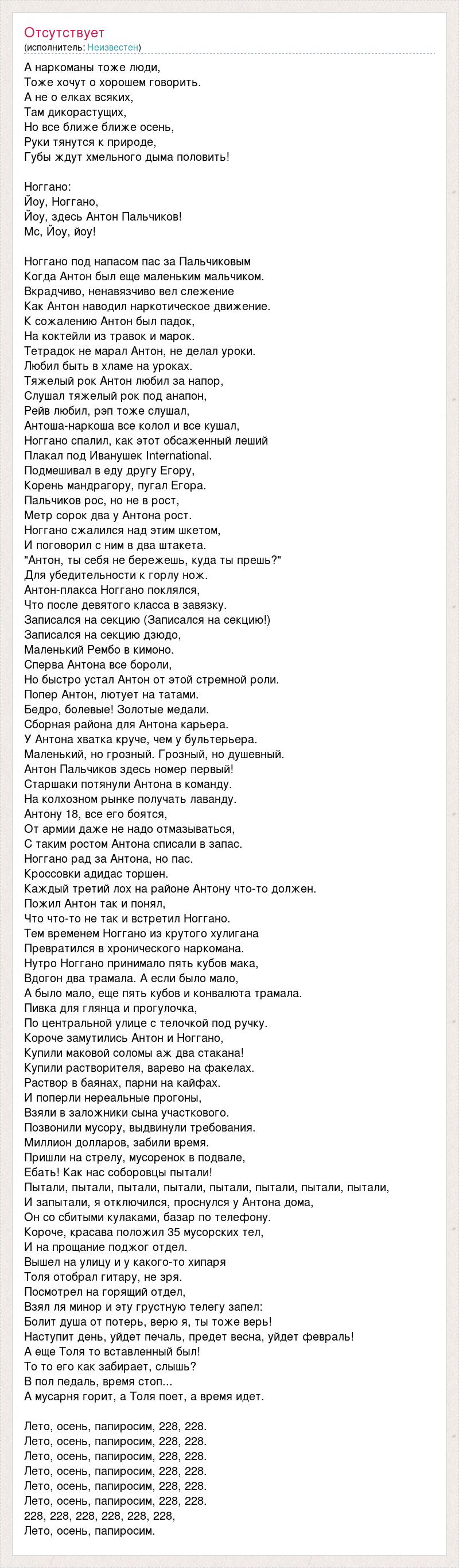 А наркоманы тоже люди, Тоже хочут о хорошем говорить. А не о елках всяких, Там дикорастущих, Но все ближе ближе осень, Руки тянутся к природе, Губы ждут хмельного дыма половить! Ноггано: Йоу, Ноггано, Йоу, здесь Антон Пальчиков! Мс, Йоу, йоу! Ноггано под напасом пас за Пальчиковым Когда Антон был еще маленьким мальчиком. Вкрадчиво, ненавязчиво вел слежение Как Антон наводил наркотическое движение. К сожалению Антон был падок, На коктейли из травок и марок. Тетрадок не марал Антон, не делал уроки. Любил быть в хламе на уроках. Тяжелый рок Антон любил за напор, Слушал тяжелый рок под анапон, Рейв любил, рэп тоже слушал, Антоша-наркоша все колол и все кушал, Ноггано спалил, как этот обсаженный леший Плакал под Иванушек International. Подмешивал в еду другу Егору, Корень мандрагору, пугал Егора. Пальчиков рос, но не в рост, Метр сорок два у Антона рост. Ноггано сжалился над этим шкетом, И поговорил с ним в два штакета. "Антон, ты себя не бережешь, куда ты прешь?" Для убедительности к горлу нож. Антон-плакса Ноггано поклялся, Что после девятого класса в завязку. Записался на секцию (Записался на секцию!) Записался на секцию дзюдо, Маленький Рембо в кимоно. Сперва Антона все бороли, Но быстро устал Антон от этой стремной роли. Попер Антон, лютует на татами. Бедро, болевые! Золотые медали. Сборная района для Антона карьера. У Антона хватка круче, чем у бультерьера. Маленький, но грозный. Грозный, но душевный. Антон Пальчиков здесь номер первый! Старшаки потянули Антона в команду. На колхозном рынке получать лаванду. Антону 18, все его боятся, От армии даже не надо отмазываться, С таким ростом Антона списали в запас. Ноггано рад за Антона, но пас. Кроссовки адидас торшен. Каждый третий лох на районе Антону что-то должен. Пожил Антон так и понял, Что что-то не так и встретил Ноггано. Тем временем Ноггано из крутого хулигана Превратился в хронического наркомана. Нутро Ноггано принимало пять кубов мака, Вдогон два трамала. А если было мало, А было мало, еще пять кубов и конвалюта трамала. Пивка для глянца и прогулочка, По центральной улице с телочкой под ручку. Короче замутились Антон и Ноггано, Купили маковой соломы аж два стакана! Купили растворителя, варево на факелах. Раствор в баянах, парни на кайфах. И поперли нереальные прогоны, Взяли в заложники сына участкового. Позвонили мусору, выдвинули требования. Миллион долларов, забили время. Пришли на стрелу, мусоренок в подвале, Ебать! Как нас соборовцы пытали! Пытали, пытали, пытали, пытали, пытали, пытали, пытали, пытали, И запытали, я отключился, проснулся у Антона дома, Он со сбитыми кулаками, базар по телефону. Короче, красава положил 35 мусорских тел, И на прощание поджог отдел. Вышел на улицу и у какого-то хипаря Толя отобрал гитару, не зря. Посмотрел на горящий отдел, Взял ля минор и эту грустную телегу запел: Болит душа от потерь, верю я, ты тоже верь! Наступит день, уйдет печаль, предет весна, уйдет февраль! А еще Толя то вставленный был! То то его как забирает, слышь? В пол педаль, время стоп... А мусарня горит, а Толя поет, а время идет. Лето, осень, папиросим, 228, 228. Лето, осень, папиросим, 228, 228. Лето, осень, папиросим, 228, 228. Лето, осень, папиросим, 228, 228. Лето, осень, папиросим, 228, 228. Лето, осень, папиросим, 228, 228. 228, 228, 228, 228, 228, 228, Лето, осень, папиросим.