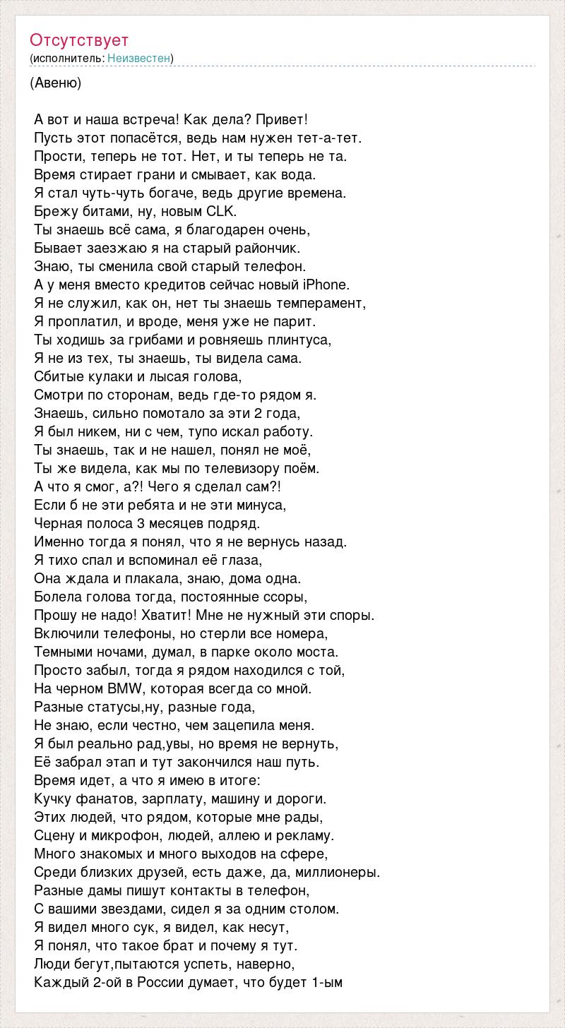 (Авеню) А вот и наша встреча! Как дела? Привет! Пусть этот попасётся, ведь нам нужен тет-а-тет. Прости, теперь не тот. Нет, и ты теперь не та. Время стирает грани и смывает, как вода. Я стал чуть-чуть богаче, ведь другие времена. Брежу битами, ну, новым CLK. Ты знаешь всё сама, я благодарен очень, Бывает заезжаю я на старый райончик. Знаю, ты сменила свой старый телефон. А у меня вместо кредитов сейчас новый iPhone. Я не служил, как он, нет ты знаешь темперамент, Я проплатил, и вроде, меня уже не парит. Ты ходишь за грибами и ровняешь плинтуса, Я не из тех, ты знаешь, ты видела сама. Сбитые кулаки и лысая голова, Смотри по сторонам, ведь где-то рядом я. Знаешь, сильно помотало за эти 2 года, Я был никем, ни с чем, тупо искал работу. Ты знаешь, так и не нашел, понял не моё, Ты же видела, как мы по телевизору поём. А что я смог, а?! Чего я сделал сам?! Если б не эти ребята и не эти минуса, Черная полоса 3 месяцев подряд. Именно тогда я понял, что я не вернусь назад. Я тихо спал и вспоминал её глаза, Она ждала и плакала, знаю, дома одна. Болела голова тогда, постоянные ссоры, Прошу не надо! Хватит! Мне не нужный эти споры. Включили телефоны, но стерли все номера, Темными ночами, думал, в парке около моста. Просто забыл, тогда я рядом находился с той, На черном BMW, которая всегда со мной. Разные статусы,ну, разные года, Не знаю, если честно, чем зацепила меня. Я был реально рад,увы, но время не вернуть, Её забрал этап и тут закончился наш путь. Время идет, а что я имею в итоге: Кучку фанатов, зарплату, машину и дороги. Этих людей, что рядом, которые мне рады, Сцену и микрофон, людей, аллею и рекламу. Много знакомых и много выходов на сфере, Среди близких друзей, есть даже, да, миллионеры. Разные дамы пишут контакты в телефон, С вашими звездами, сидел я за одним столом. Я видел много сук, я видел, как несут, Я понял, что такое брат и почему я тут. Люди бегут,пытаются успеть, наверно, Каждый 2-ой в России думает, что будет 1-ым