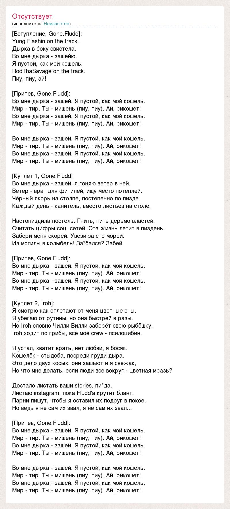 [Вступление, Gone.Fludd]: Yung Flashin on the track. Дырка в боку свистела. Во мне дырка - зашейю. Я пустой, как мой кошель. RodThaSavage on the track. Пиу, пиу, ай! [Припев, Gone.Fludd]: Во мне дырка - зашей. Я пустой, как мой кошель. Мир - тир. Ты - мишень (пиу, пиу). Ай, рикошет! Во мне дырка - зашей. Я пустой, как мой кошель. Мир - тир. Ты - мишень (пиу, пиу). Ай, рикошет! Во мне дырка - зашей. Я пустой, как мой кошель. Мир - тир. Ты - мишень (пиу, пиу). Ай, рикошет! Во мне дырка - зашей. Я пустой, как мой кошель. Мир - тир. Ты - мишень (пиу, пиу). Ай, рикошет! [Куплет 1, Gone.Fludd] Во мне дырка - зашей, я гоняю ветер в ней. Ветер - враг для фитилей, ищу место потеплей. Чёрный якорь на столпе, постепенно по пизде. Каждый день - канитель, вместо листьев на столе. Настопиздила постель. Гнить, пить дерьмо властей. Считать цифры соц. сетей. Эта жизнь летит в пиздень. Забери меня скорей. Увези за сто морей. Из могилы в колыбель! За*бался? Забей. [Припев, Gone.Fludd]: Во мне дырка - зашей. Я пустой, как мой кошель. Мир - тир. Ты - мишень (пиу, пиу). Ай, рикошет! Во мне дырка - зашей. Я пустой, как мой кошель. Мир - тир. Ты - мишень (пиу, пиу). Ай, рикошет! [Куплет 2, Iroh]: Я смотрю как отлетают от меня цветные сны. Я убегаю от рутины, но она быстрей в разы. Но Iroh словно Чилли Вилли заберёт свою рыбёшку. Iroh ходит по грибы, всё моё crew - псилоцибин. Я устал, хватит врать, нет любви, я босяк. Кошелёк - стыдоба, посреди груди дыра. Это дело двух косых, они зашьют и я свежак, Но что мне делать, если люди все вокруг - цветная мразь? Достало листать ваши stories, пи*да. Листаю instagram, пока Fludd'а крутит блант. Парни пишут, чтобы я оставил их подруг в покое. Но ведь я не сам их звал, я не сам их звал... [Припев, Gone.Fludd]: Во мне дырка - зашей. Я пустой, как мой кошель. Мир - тир. Ты - мишень (пиу, пиу). Ай, рикошет! Во мне дырка - зашей. Я пустой, как мой кошель. Мир - тир. Ты - мишень (пиу, пиу). Ай, рикошет! Во мне дырка - зашей. Я пустой, как мой кошель. Мир - тир. Ты - мишень (пиу, пиу). Ай, рикошет! Во мне дырка - зашей. Я пустой, как мой кошель. Мир - тир. Ты - мишень (пиу, пиу). Ай, рикошет!