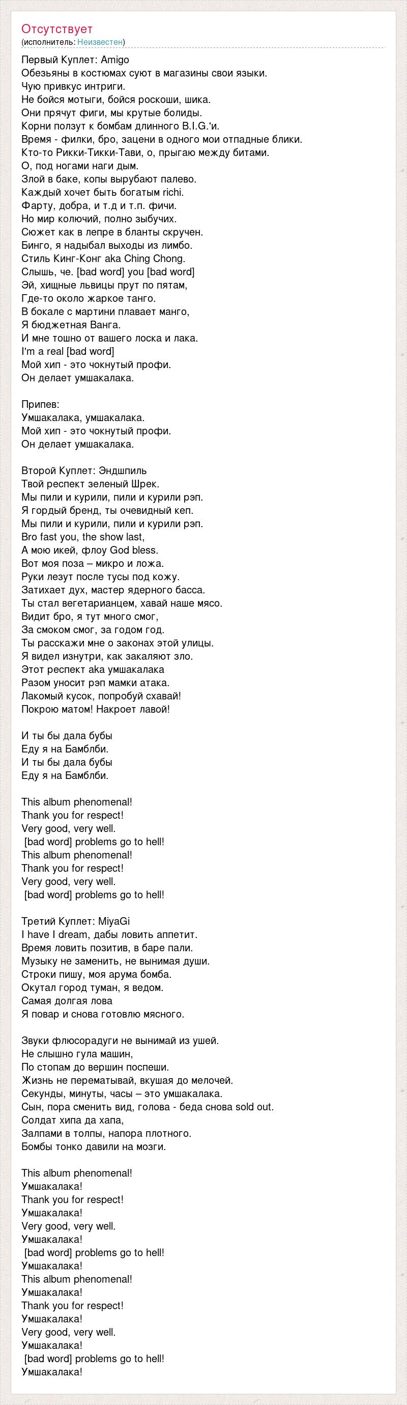 Первый Куплет: Amigo Обезьяны в костюмах суют в магазины свои языки. Чую привкус интриги. Не бойся мотыги, бойся роскоши, шика. Они прячут фиги, мы крутые болиды. Корни ползут к бомбам длинного B.I.G.'и. Время - филки, бро, зацени в одного мои отпадные блики. Кто-то Рикки-Тикки-Тави, о, прыгаю между битами. О, под ногами наги дым. Злой в баке, копы вырубают палево. Каждый хочет быть богатым richi. Фарту, добра, и т.д и т.п. фичи. Но мир колючий, полно зыбучих. Сюжет как в лепре в бланты скручен. Бинго, я надыбал выходы из лимбо. Стиль Кинг-Конг aka Ching Chong. Слышь, че. [bad word] you [bad word] Эй, хищные львицы прут по пятам, Где-то около жаркое танго. В бокале с мартини плавает манго, Я бюджетная Ванга. И мне тошно от вашего лоска и лака. I'm a real [bad word] Мой хип - это чокнутый профи. Он делает умшакалака. Припев: Умшакалака, умшакалака. Мой хип - это чокнутый профи. Он делает умшакалака. Второй Куплет: Эндшпиль Твой респект зеленый Шрек. Мы пили и курили, пили и курили рэп. Я гордый бренд, ты очевидный кеп. Мы пили и курили, пили и курили рэп. Bro fast you, the show last, А мою икей, флоу God bless. Вот моя поза – микро и ложа. Руки лезут после тусы под кожу. Затихает дух, мастер ядерного басса. Ты стал вегетарианцем, хавай наше мясо. Видит бро, я тут много смог, За смоком смог, за годом год. Ты расскажи мне о законах этой улицы. Я видел изнутри, как закаляют зло. Этот респект aka умшакалака Разом уносит рэп мамки атака. Лакомый кусок, попробуй схавай! Покрою матом! Накроет лавой! И ты бы дала бубы Еду я на Бамблби. И ты бы дала бубы Еду я на Бамблби. This album phenomenal! Thank you for respect! Very good, very well. [bad word] problems go to hell! This album phenomenal! Thank you for respect! Very good, very well. [bad word] problems go to hell! Третий Куплет: MiyaGi I have I dream, дабы ловить аппетит. Время ловить позитив, в баре пали. Музыку не заменить, не вынимая души. Строки пишу, моя арума бомба. Окутал город туман, я ведом. Самая долгая лова Я повар и снова готовлю мясного. Звуки флюсорадуги не вынимай из ушей. Не слышно гула машин, По стопам до вершин поспеши. Жизнь не перематывай, вкушая до мелочей. Секунды, минуты, часы – это умшакалака. Сын, пора сменить вид, голова - беда снова sold out. Солдат хипа да хапа, Залпами в толпы, напора плотного. Бомбы тонко давили на мозги. This album phenomenal! Умшакалака! Thank you for respect! Умшакалака! Very good, very well. Умшакалака! [bad word] problems go to hell! Умшакалака! This album phenomenal! Умшакалака! Thank you for respect! Умшакалака! Very good, very well. Умшакалака! [bad word] problems go to hell! Умшакалака!