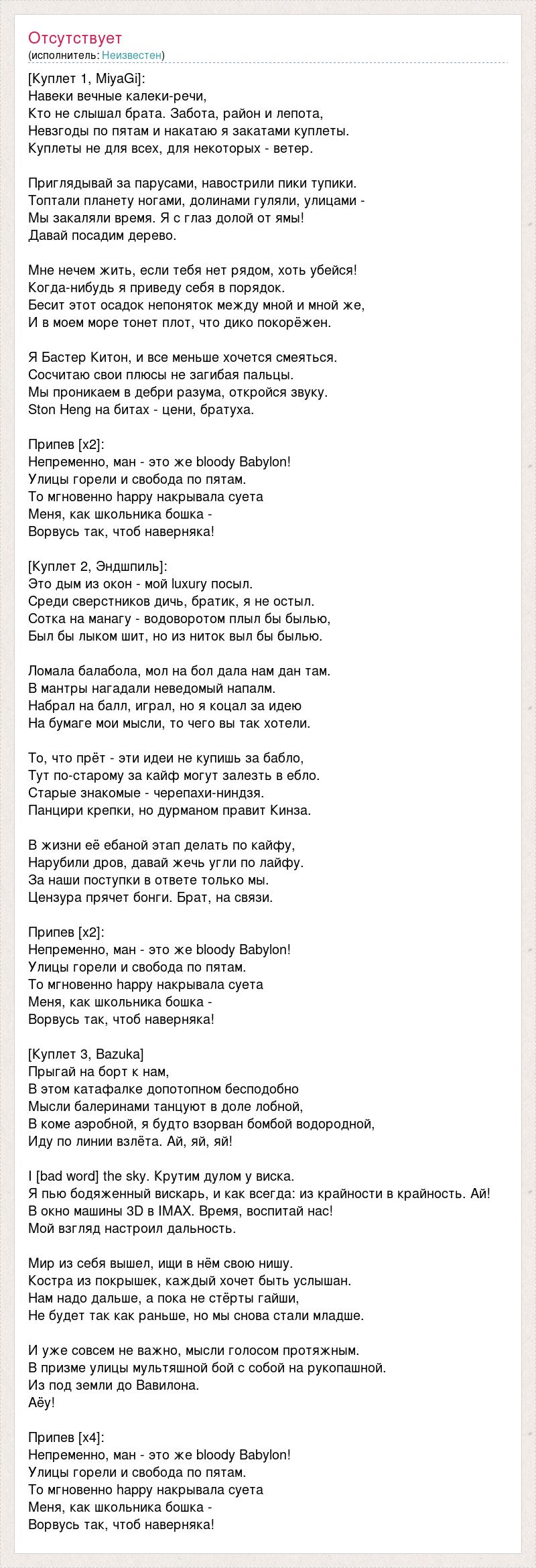 [Куплет 1, MiyaGi]: Навеки вечные калеки-речи, Кто не слышал брата. Забота, район и лепота, Невзгоды по пятам и накатаю я закатами куплеты. Куплеты не для всех, для некоторых - ветер. Приглядывай за парусами, навострили пики тупики. Топтали планету ногами, долинами гуляли, улицами - Мы закаляли время. Я с глаз долой от ямы! Давай посадим дерево. Мне нечем жить, если тебя нет рядом, хоть убейся! Когда-нибудь я приведу себя в порядок. Бесит этот осадок непоняток между мной и мной же, И в моем море тонет плот, что дико покорёжен. Я Бастер Китон, и все меньше хочется смеяться. Сосчитаю свои плюсы не загибая пальцы. Мы проникаем в дебри разума, откройся звуку. Ston Heng на битах - цени, братуха. Припев [х2]: Непременно, ман - это же bloody Babylon! Улицы горели и свобода по пятам. То мгновенно happy накрывала суета Меня, как школьника бошка - Ворвусь так, чтоб наверняка! [Куплет 2, Эндшпиль]: Это дым из окон - мой luxury посыл. Среди сверстников дичь, братик, я не остыл. Сотка на манагу - водоворотом плыл бы былью, Был бы лыком шит, но из ниток выл бы былью. Ломала балабола, мол на бол дала нам дан там. В мантры нагадали неведомый напалм. Набрал на балл, играл, но я коцал за идею На бумаге мои мысли, то чего вы так хотели. То, что прёт - эти идеи не купишь за бабло, Тут по-старому за кайф могут залезть в ебло. Старые знакомые - черепахи-ниндзя. Панцири крепки, но дурманом правит Кинза. В жизни её ебаной этап делать по кайфу, Нарубили дров, давай жечь угли по лайфу. За наши поступки в ответе только мы. Цензура прячет бонги. Брат, на связи. Припев [х2]: Непременно, ман - это же bloody Babylon! Улицы горели и свобода по пятам. То мгновенно happy накрывала суета Меня, как школьника бошка - Ворвусь так, чтоб наверняка! [Куплет 3, Bazuka] Прыгай на борт к нам, В этом катафалке допотопном бесподобно Мысли балеринами танцуют в доле лобной, В коме аэробной, я будто взорван бомбой водородной, Иду по линии взлёта. Ай, яй, яй! I [bad word] the sky. Крутим дулом у виска. Я пью бодяженный вискарь, и как всегда: из крайности в крайность. Ай! В окно машины 3D в IMAX. Время, воспитай нас! Мой взгляд настроил дальность. Мир из себя вышел, ищи в нём свою нишу. Костра из покрышек, каждый хочет быть услышан. Нам надо дальше, а пока не стёрты гайши, Не будет так как раньше, но мы снова стали младше. И уже совсем не важно, мысли голосом протяжным. В призме улицы мультяшной бой с собой на рукопашной. Из под земли до Вавилона. Аёу! Припев [х4]: Непременно, ман - это же bloody Babylon! Улицы горели и свобода по пятам. То мгновенно happy накрывала суета Меня, как школьника бошка - Ворвусь так, чтоб наверняка!