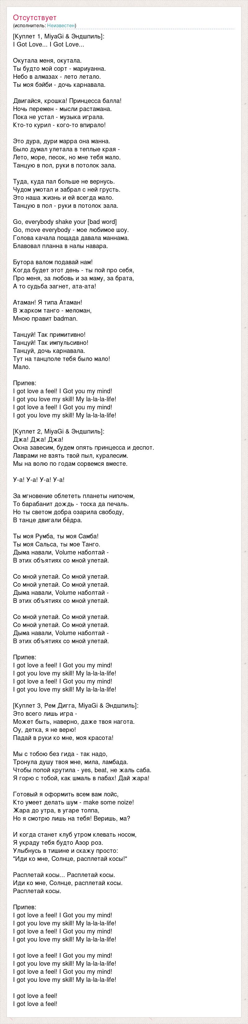 [Куплет 1, MiyaGi & Эндшпиль]: I Got Love... I Got Love... Окутала меня, окутала. Ты будто мой сорт - мариуанна. Небо в алмазах - лето летало. Ты моя бэйби - дочь карнавала. Двигайся, крошка! Принцесса балла! Ночь перемен - мысли растамана. Пока не устал - музыка играла. Кто-то курил - кого-то впирало! Это дура, дури марра она манна. Было думал улетала в теплые края - Лето, море, песок, но мне тебя мало. Танцую в пол, руки в потолок зала. Туда, куда пал больше не вернусь. Чудом умотал и забрал с ней грусть. Это наша жизнь и ей всегда мало. Танцую в пол - руки в потолок зала. Go, everybody shake your [bad word] Go, move everybody - мое любимое шоу. Голова качала пощада давала маннама. Блавовал планна в налы навара. Бутора валом подавай нам! Когда будет этот день - ты пой про себя, Про меня, за любовь и за маму, за брата, А то судьба загнет, ата-ата! Атаман! Я типа Атаман! В жарком танго - меломан, Мною правит badman. Танцуй! Так примитивно! Танцуй! Так импульсивно! Танцуй, дочь карнавала. Тут на танцполе тебя было мало! Мало. Припев: I got love a feel! I Got you my mind! I got you love my skill! My la-la-la-life! I got love a feel! I Got you my mind! I got you love my skill! My la-la-la-life! [Куплет 2, MiyaGi & Эндшпиль]: Джа! Джа! Джа! Окна завесим, будем опять принцесса и деспот. Лаврами не взять твой пыл, куралесим. Мы на волю по годам сорвемся вместе. У-а! У-а! У-а! У-а! За мгновение облететь планеты нипочем, То барабанит дождь - тоска да печаль. Но ты светом добра озарила свободу, В танце двигали бёдра. Ты моя Румба, ты моя Самба! Ты моя Сальса, ты мое Танго. Дыма навали, Volume наболтай - В этих объятиях со мной улетай. Со мной улетай. Со мной улетай. Со мной улетай. Со мной улетай. Дыма навали, Volume наболтай - В этих объятиях со мной улетай. Со мной улетай. Со мной улетай. Со мной улетай. Со мной улетай. Дыма навали, Volume наболтай - В этих объятиях со мной улетай. Припев: I got love a feel! I Got you my mind! I got you love my skill! My la-la-la-life! I got love a feel! I Got you my mind! I got you love my skill! My la-la-la-life! [Куплет 3, Рем Дигга, MiyaGi & Эндшпиль]: Это всего лишь игра - Может быть, наверно, даже твоя нагота. Оу, детка, я не верю! Падай в руки ко мне, моя красота! Мы с тобою без гида - так надо, Тронула душу твоя мне, мила, ламбада. Чтобы попой крутила - yes, beat, не жаль саба. Я горю с тобой, как шмаль в пабах! Дай жара! Готовый я оформить всем вам лойс, Кто умеет делать шум - make some noize! Жара до утра, в угаре толпа, Но я смотрю лишь на тебя! Веришь, ма? И когда станет клуб утром клевать носом, Я украду тебя будто Азор роз. Улыбнусь в тишине и скажу просто: "Иди ко мне, Солнце, расплетай косы!" Расплетай косы... Расплетай косы. Иди ко мне, Солнце, расплетай косы. Расплетай косы. Припев: I got love a feel! I Got you my mind! I got you love my skill! My la-la-la-life! I got love a feel! I Got you my mind! I got you love my skill! My la-la-la-life! I got love a feel! I Got you my mind! I got you love my skill! My la-la-la-life! I got love a feel! I Got you my mind! I got you love my skill! My la-la-la-life! I got love a feel! I got love a feel!