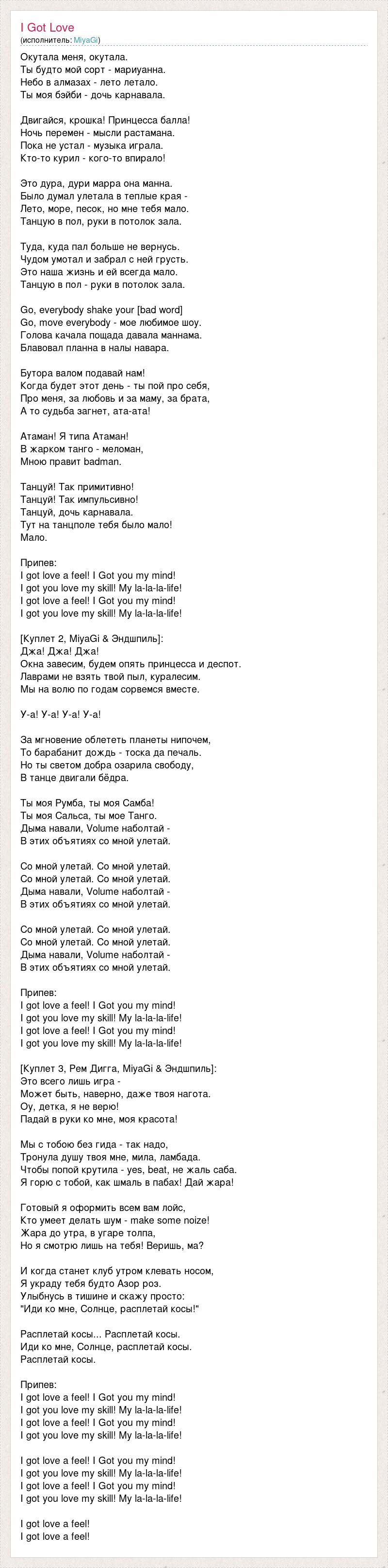 Окутала меня, окутала. Ты будто мой сорт - мариуанна. Небо в алмазах - лето летало. Ты моя бэйби - дочь карнавала. Двигайся, крошка! Принцесса балла! Ночь перемен - мысли растамана. Пока не устал - музыка играла. Кто-то курил - кого-то впирало! Это дура, дури марра она манна. Было думал улетала в теплые края - Лето, море, песок, но мне тебя мало. Танцую в пол, руки в потолок зала. Туда, куда пал больше не вернусь. Чудом умотал и забрал с ней грусть. Это наша жизнь и ей всегда мало. Танцую в пол - руки в потолок зала. Go, everybody shake your [bad word] Go, move everybody - мое любимое шоу. Голова качала пощада давала маннама. Блавовал планна в налы навара. Бутора валом подавай нам! Когда будет этот день - ты пой про себя, Про меня, за любовь и за маму, за брата, А то судьба загнет, ата-ата! Атаман! Я типа Атаман! В жарком танго - меломан, Мною правит badman. Танцуй! Так примитивно! Танцуй! Так импульсивно! Танцуй, дочь карнавала. Тут на танцполе тебя было мало! Мало. Припев: I got love a feel! I Got you my mind! I got you love my skill! My la-la-la-life! I got love a feel! I Got you my mind! I got you love my skill! My la-la-la-life! [Куплет 2, MiyaGi & Эндшпиль]: Джа! Джа! Джа! Окна завесим, будем опять принцесса и деспот. Лаврами не взять твой пыл, куралесим. Мы на волю по годам сорвемся вместе. У-а! У-а! У-а! У-а! За мгновение облететь планеты нипочем, То барабанит дождь - тоска да печаль. Но ты светом добра озарила свободу, В танце двигали бёдра. Ты моя Румба, ты моя Самба! Ты моя Сальса, ты мое Танго. Дыма навали, Volume наболтай - В этих объятиях со мной улетай. Со мной улетай. Со мной улетай. Со мной улетай. Со мной улетай. Дыма навали, Volume наболтай - В этих объятиях со мной улетай. Со мной улетай. Со мной улетай. Со мной улетай. Со мной улетай. Дыма навали, Volume наболтай - В этих объятиях со мной улетай. Припев: I got love a feel! I Got you my mind! I got you love my skill! My la-la-la-life! I got love a feel! I Got you my mind! I got you love my skill! My la-la-la-life! [Куплет 3, Рем Дигга, MiyaGi & Эндшпиль]: Это всего лишь игра - Может быть, наверно, даже твоя нагота. Оу, детка, я не верю! Падай в руки ко мне, моя красота! Мы с тобою без гида - так надо, Тронула душу твоя мне, мила, ламбада. Чтобы попой крутила - yes, beat, не жаль саба. Я горю с тобой, как шмаль в пабах! Дай жара! Готовый я оформить всем вам лойс, Кто умеет делать шум - make some noize! Жара до утра, в угаре толпа, Но я смотрю лишь на тебя! Веришь, ма? И когда станет клуб утром клевать носом, Я украду тебя будто Азор роз. Улыбнусь в тишине и скажу просто: "Иди ко мне, Солнце, расплетай косы!" Расплетай косы... Расплетай косы. Иди ко мне, Солнце, расплетай косы. Расплетай косы. Припев: I got love a feel! I Got you my mind! I got you love my skill! My la-la-la-life! I got love a feel! I Got you my mind! I got you love my skill! My la-la-la-life! I got love a feel! I Got you my mind! I got you love my skill! My la-la-la-life! I got love a feel! I Got you my mind! I got you love my skill! My la-la-la-life! I got love a feel! I got love a feel!