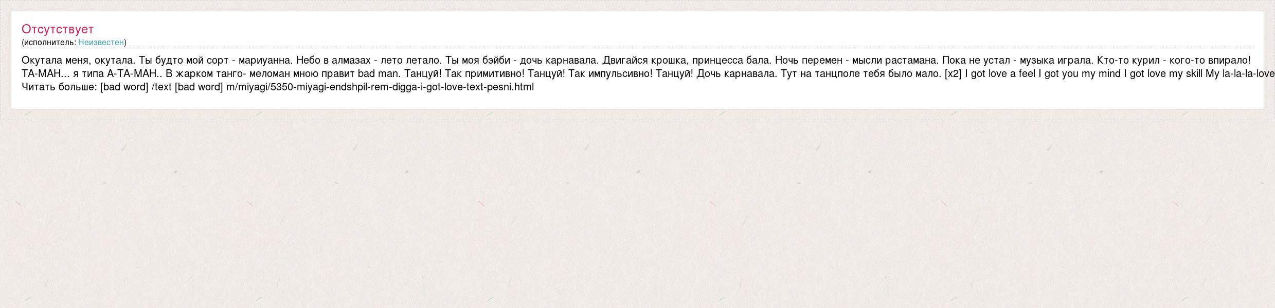 Окутала меня, окутала. Ты будто мой сорт - мариуанна. Небо в алмазах - лето летало. Ты моя бэйби - дочь карнавала. Двигайся крошка, принцесса бала. Ночь перемен - мысли растамана. Пока не устал - музыка играла. Кто-то курил - кого-то впирало! ТА-МАН... я типа А-ТА-МАН.. В жарком танго- меломан мною правит bad man. Танцуй! Так примитивно! Танцуй! Так импульсивно! Танцуй! Дочь карнавала. Тут на танцполе тебя было мало. [x2] I got love a feel I got you my mind I got love my skill My la-la-la-love Читать больше: [bad word] /text [bad word] m/miyagi/5350-miyagi-endshpil-rem-digga-i-got-love-text-pesni.html