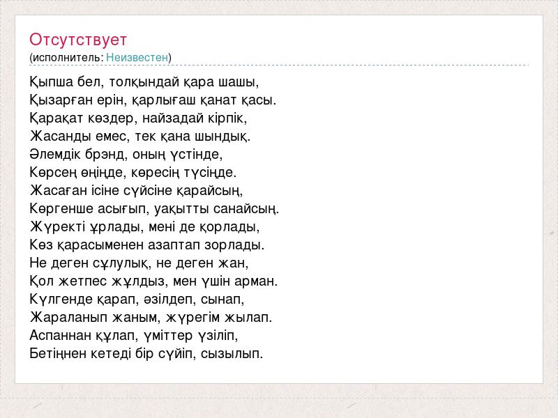 Қыпша бел, толқындай қара шашы, Қызарған ерін, қарлығаш қанат қасы. Қарақат көздер, найзадай кірпік, Жасанды емес, тек қана шындық. Әлемдік брэнд, оның үстінде, Көрсең өңіңде, көресің түсіңде. Жасаған ісіне сүйсіне қарайсың, Көргенше асығып, уақытты санайсың. Жүректі ұрлады, мені де қорлады, Көз қарасыменен азаптап зорлады. Не деген сұлулық, не деген жан, Қол жетпес жұлдыз, мен үшін арман. Күлгенде қарап, әзілдеп, сынап, Жараланып жаным, жүрегім жылап. Аспаннан құлап, үміттер үзіліп, Бетіңнен кетеді бір сүйіп, сызылып.