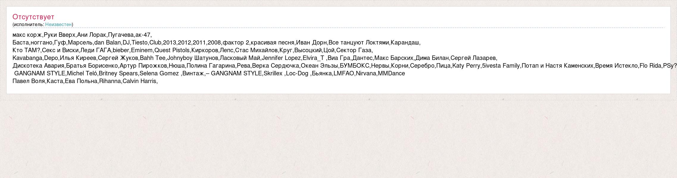 макс корж,Руки Вверх,Ани Лорак,Пугачева,ак-47, Баста,ноггано,Гуф,Марсель,dan Balan,DJ,Tiesto,Club,2013,2012,2011,2008,фактор 2,красивая песня,Иван Дорн,Все танцуют Локтями,Карандаш, Кто ТАМ?,Секс и Виски,Леди ГАГА,bieber,Eminem,Quest Pistols,Киркоров,Лепс,Стас Михайлов,Круг,Высоцкий,Цой,Сектор Газа, Kavabanga,Depo,Илья Киреев,Сергей Жуков,Bahh Tee,Johnyboy Шатунов,Ласковый Май,Jennifer Lopez,Elvira_T ,Виа Гра,Дантес,Макс Барских,Дима Билан,Сергей Лазарев, Дискотека Авария,Братья Борисенко,Артур Пирожков,Нюша,Полина Гагарина,Рева,Верка Сердючка,Океан Эльзы,БУМБОКС,Нервы,Корни,Серебро,Пица,Katy Perry,5ivesta Family,Потап и Настя Каменских,Время Истекло,Flo Rida,PSy? GANGNAM STYLE,Michel Teló,Britney Spears,Selena Gomez ,Винтаж,– GANGNAM STYLE,Skrillex ,Loc-Dog ,Бьянка,LMFAO,Nirvana,MMDance Павел Воля,Каста,Ева Польна,Rihanna,Calvin Harris,