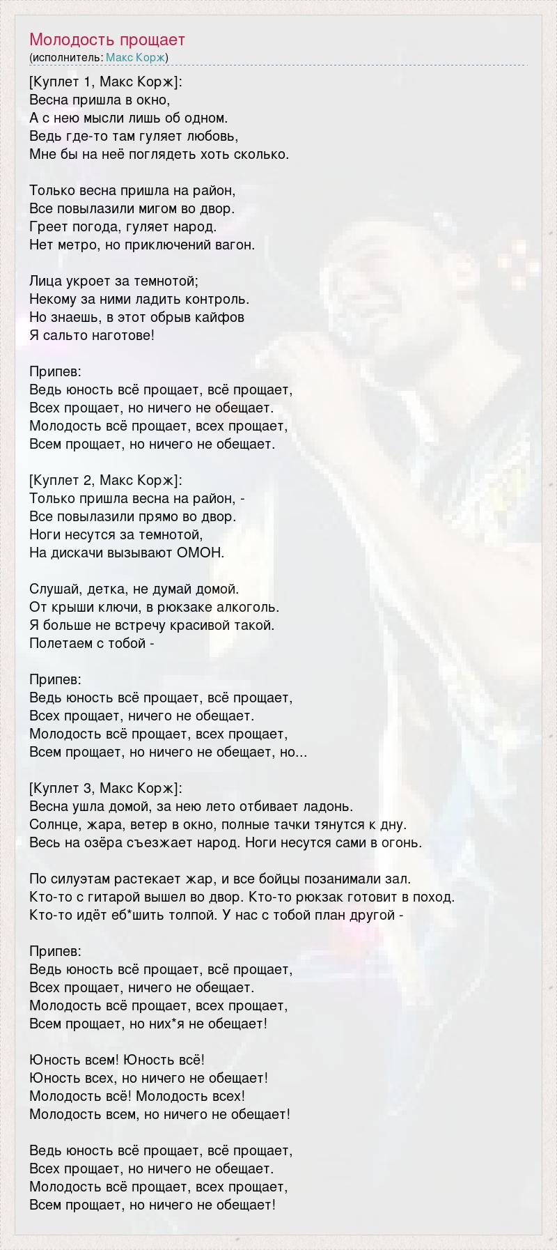 [Куплет 1, Макс Корж]: Весна пришла в окно, А с нею мысли лишь об одном. Ведь где-то там гуляет любовь, Мне бы на неё поглядеть хоть сколько. Только весна пришла на район, Все повылазили мигом во двор. Греет погода, гуляет народ. Нет метро, но приключений вагон. Лица укроет за темнотой; Некому за ними ладить контроль. Но знаешь, в этот обрыв кайфов Я сальто наготове! Припев: Ведь юность всё прощает, всё прощает, Всех прощает, но ничего не обещает. Молодость всё прощает, всех прощает, Всем прощает, но ничего не обещает. [Куплет 2, Макс Корж]: Только пришла весна на район, - Все повылазили прямо во двор. Ноги несутся за темнотой, На дискачи вызывают ОМОН. Слушай, детка, не думай домой. От крыши ключи, в рюкзаке алкоголь. Я больше не встречу красивой такой. Полетаем с тобой - Припев: Ведь юность всё прощает, всё прощает, Всех прощает, ничего не обещает. Молодость всё прощает, всех прощает, Всем прощает, но ничего не обещает, но... [Куплет 3, Макс Корж]: Весна ушла домой, за нею лето отбивает ладонь. Солнце, жара, ветер в окно, полные тачки тянутся к дну. Весь на озёра съезжает народ. Ноги несутся сами в огонь. По силуэтам растекает жар, и все бойцы позанимали зал. Кто-то с гитарой вышел во двор. Кто-то рюкзак готовит в поход. Кто-то идёт еб*шить толпой. У нас с тобой план другой - Припев: Ведь юность всё прощает, всё прощает, Всех прощает, ничего не обещает. Молодость всё прощает, всех прощает, Всем прощает, но них*я не обещает! Юность всем! Юность всё! Юность всех, но ничего не обещает! Молодость всё! Молодость всех! Молодость всем, но ничего не обещает! Ведь юность всё прощает, всё прощает, Всех прощает, но ничего не обещает. Молодость всё прощает, всех прощает, Всем прощает, но ничего не обещает!