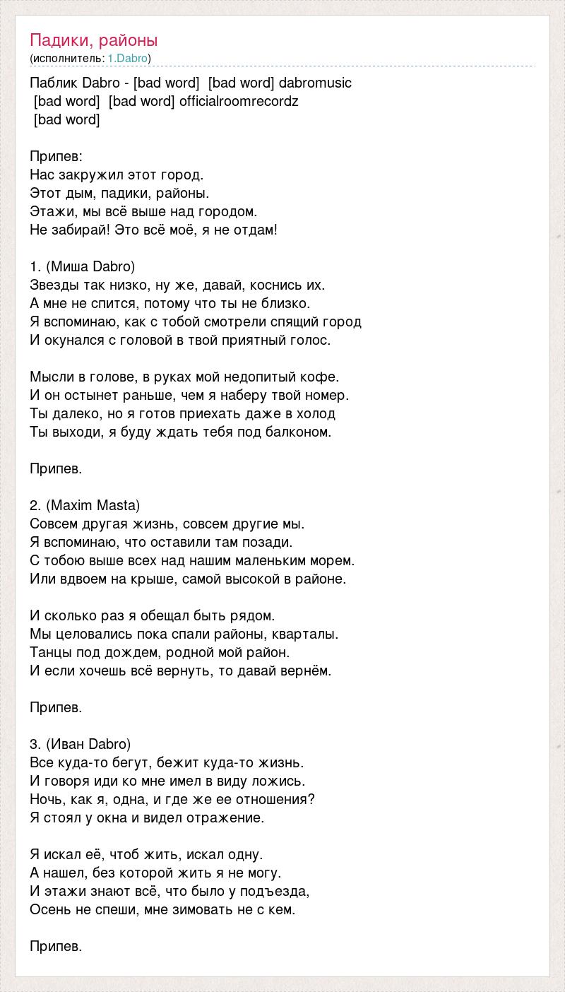 Паблик Dabro - [bad word] [bad word] dabromusic [bad word] [bad word] officialroomrecordz [bad word] Припев: Нас закружил этот город. Этот дым, падики, районы. Этажи, мы всё выше над городом. Не забирай! Это всё моё, я не отдам! 1. (Миша Dabro) Звезды так низко, ну же, давай, коснись их. А мне не спится, потому что ты не близко. Я вспоминаю, как с тобой смотрели спящий город И окунался с головой в твой приятный голос. Мысли в голове, в руках мой недопитый кофе. И он остынет раньше, чем я наберу твой номер. Ты далеко, но я готов приехать даже в холод Ты выходи, я буду ждать тебя под балконом. Припев. 2. (Maxim Masta) Совсем другая жизнь, совсем другие мы. Я вспоминаю, что оставили там позади. С тобою выше всех над нашим маленьким морем. Или вдвоем на крыше, самой высокой в районе. И сколько раз я обещал быть рядом. Мы целовались пока спали районы, кварталы. Танцы под дождем, родной мой район. И если хочешь всё вернуть, то давай вернём. Припев. 3. (Иван Dabro) Все куда-то бегут, бежит куда-то жизнь. И говоря иди ко мне имел в виду ложись. Ночь, как я, одна, и где же ее отношения? Я стоял у окна и видел отражение. Я искал её, чтоб жить, искал одну. А нашел, без которой жить я не могу. И этажи знают всё, что было у подъезда, Осень не спеши, мне зимовать не с кем. Припев.