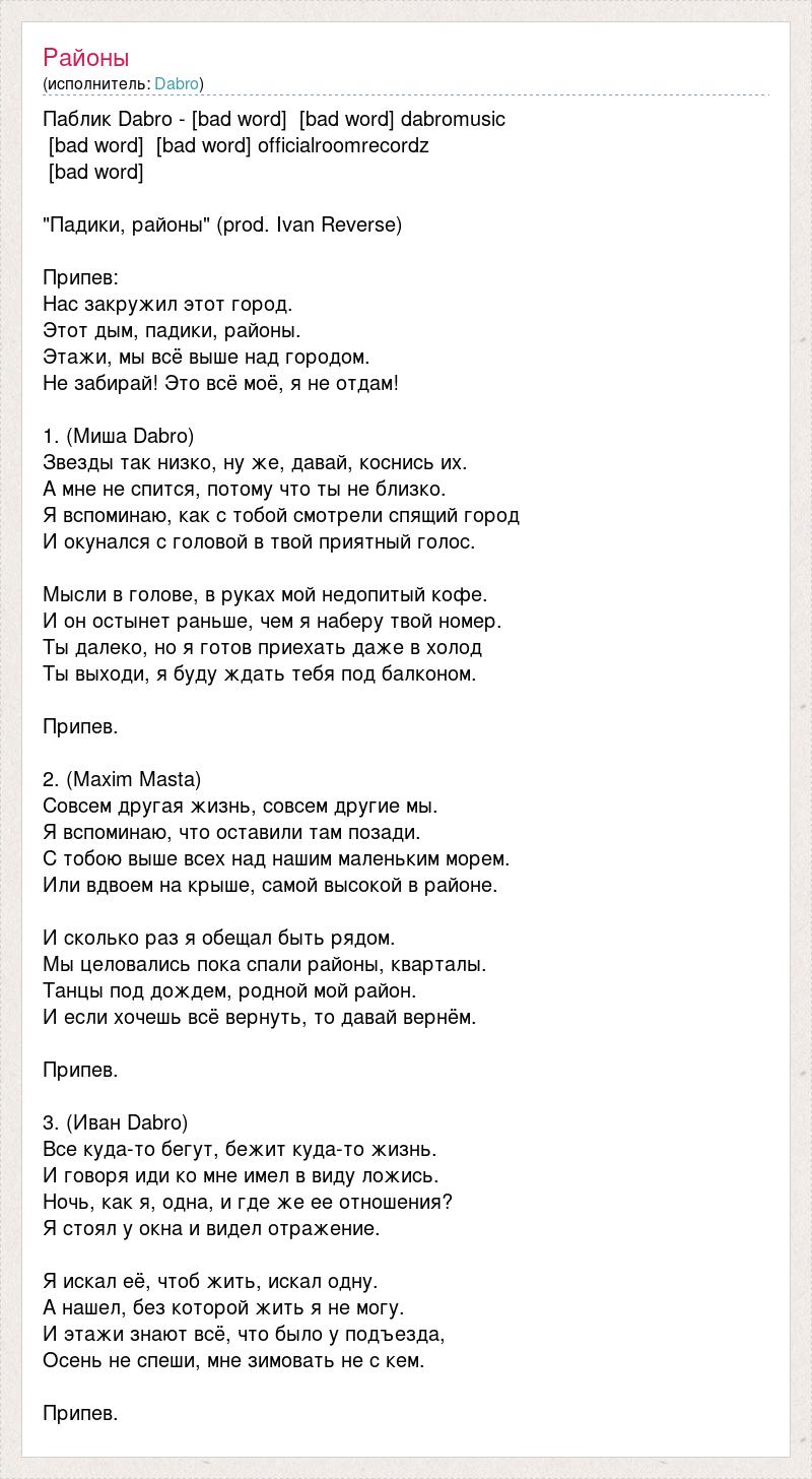 Паблик Dabro - [bad word] [bad word] dabromusic [bad word] [bad word] officialroomrecordz [bad word] "Падики, районы" (prod. Ivan Reverse) Припев: Нас закружил этот город. Этот дым, падики, районы. Этажи, мы всё выше над городом. Не забирай! Это всё моё, я не отдам! 1. (Миша Dabro) Звезды так низко, ну же, давай, коснись их. А мне не спится, потому что ты не близко. Я вспоминаю, как с тобой смотрели спящий город И окунался с головой в твой приятный голос. Мысли в голове, в руках мой недопитый кофе. И он остынет раньше, чем я наберу твой номер. Ты далеко, но я готов приехать даже в холод Ты выходи, я буду ждать тебя под балконом. Припев. 2. (Maxim Masta) Совсем другая жизнь, совсем другие мы. Я вспоминаю, что оставили там позади. С тобою выше всех над нашим маленьким морем. Или вдвоем на крыше, самой высокой в районе. И сколько раз я обещал быть рядом. Мы целовались пока спали районы, кварталы. Танцы под дождем, родной мой район. И если хочешь всё вернуть, то давай вернём. Припев. 3. (Иван Dabro) Все куда-то бегут, бежит куда-то жизнь. И говоря иди ко мне имел в виду ложись. Ночь, как я, одна, и где же ее отношения? Я стоял у окна и видел отражение. Я искал её, чтоб жить, искал одну. А нашел, без которой жить я не могу. И этажи знают всё, что было у подъезда, Осень не спеши, мне зимовать не с кем. Припев.