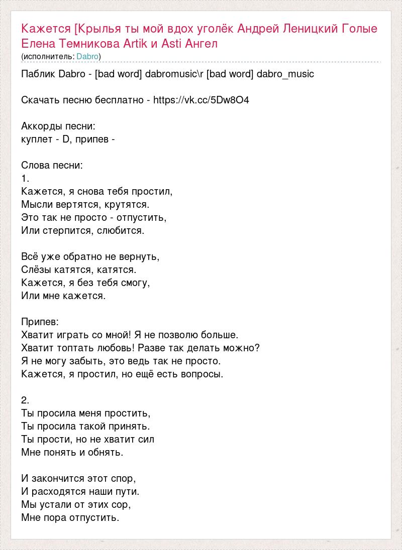 Паблик Dabro - [bad word] dabromusic [bad word] dabro_music Скачать песню бесплатно - https://vk.cc/5Dw8O4 Аккорды песни: куплет - D, припев - Слова песни: 1. Кажется, я снова тебя простил, Мысли вертятся, крутятся. Это так не просто - отпустить, Или стерпится, слюбится. Всё уже обратно не вернуть, Слёзы катятся, катятся. Кажется, я без тебя смогу, Или мне кажется. Припев: Хватит играть со мной! Я не позволю больше. Хватит топтать любовь! Разве так делать можно? Я не могу забыть, это ведь так не просто. Кажется, я простил, но ещё есть вопросы. 2. Ты просила меня простить, Ты просила такой принять. Ты прости, но не хватит сил Мне понять и обнять. И закончится этот спор, И расходятся наши пути. Мы устали от этих сор, Мне пора отпустить.