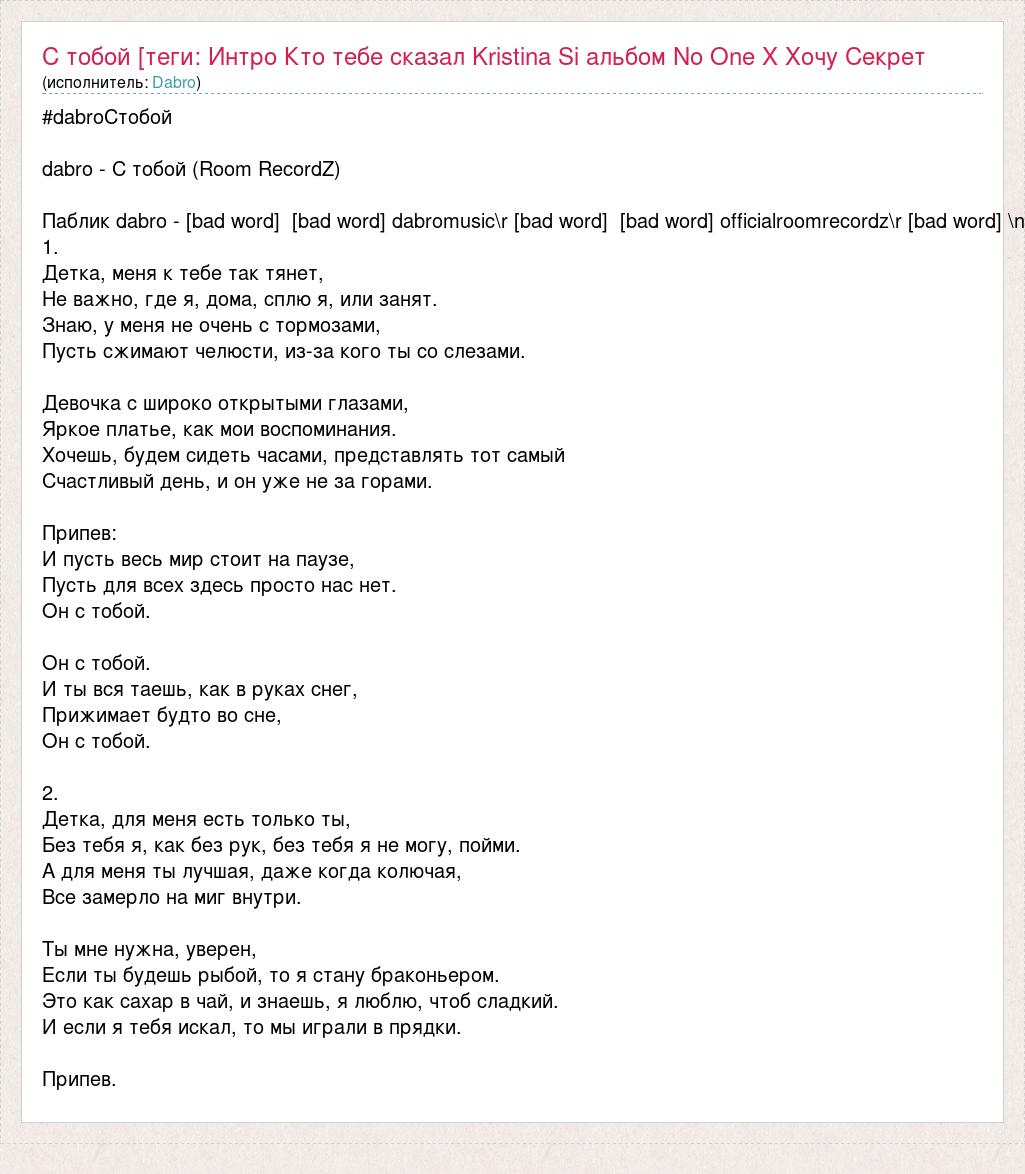 #dabroСтобой dabro - С тобой (Room RecordZ) Паблик dabro - [bad word] [bad word] dabromusic [bad word] [bad word] officialroomrecordz [bad word] 1. Детка, меня к тебе так тянет, Не важно, где я, дома, сплю я, или занят. Знаю, у меня не очень с тормозами, Пусть сжимают челюсти, из-за кого ты со слезами. Девочка с широко открытыми глазами, Яркое платье, как мои воспоминания. Хочешь, будем сидеть часами, представлять тот самый Счастливый день, и он уже не за горами. Припев: И пусть весь мир стоит на паузе, Пусть для всех здесь просто нас нет. Он с тобой. Он с тобой. И ты вся таешь, как в руках снег, Прижимает будто во сне, Он с тобой. 2. Детка, для меня есть только ты, Без тебя я, как без рук, без тебя я не могу, пойми. А для меня ты лучшая, даже когда колючая, Все замерло на миг внутри. Ты мне нужна, уверен, Если ты будешь рыбой, то я стану браконьером. Это как сахар в чай, и знаешь, я люблю, чтоб сладкий. И если я тебя искал, то мы играли в прядки. Припев.