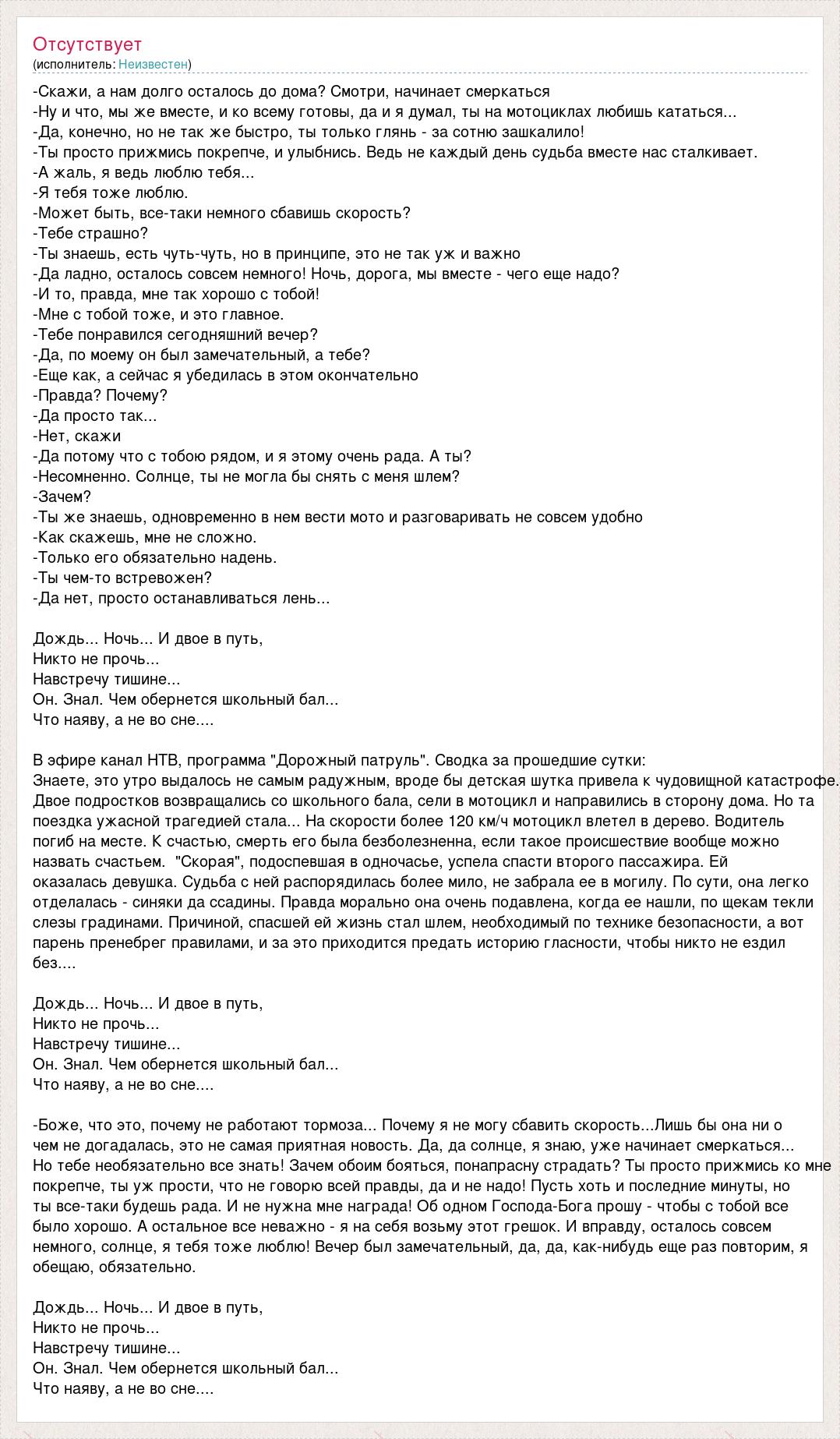 -Скажи, а нам долго осталось до дома? Смотри, начинает смеркаться -Ну и что, мы же вместе, и ко всему готовы, да и я думал, ты на мотоциклах любишь кататься... -Да, конечно, но не так же быстро, ты только глянь - за сотню зашкалило! -Ты просто прижмись покрепче, и улыбнись. Ведь не каждый день судьба вместе нас сталкивает. -А жаль, я ведь люблю тебя... -Я тебя тоже люблю. -Может быть, все-таки немного сбавишь скорость? -Тебе страшно? -Ты знаешь, есть чуть-чуть, но в принципе, это не так уж и важно -Да ладно, осталось совсем немного! Ночь, дорога, мы вместе - чего еще надо? -И то, правда, мне так хорошо с тобой! -Мне с тобой тоже, и это главное. -Тебе понравился сегодняшний вечер? -Да, по моему он был замечательный, а тебе? -Еще как, а сейчас я убедилась в этом окончательно -Правда? Почему? -Да просто так... -Нет, скажи -Да потому что с тобою рядом, и я этому очень рада. А ты? -Несомненно. Солнце, ты не могла бы снять с меня шлем? -Зачем? -Ты же знаешь, одновременно в нем вести мото и разговаривать не совсем удобно -Как скажешь, мне не сложно. -Только его обязательно надень. -Ты чем-то встревожен? -Да нет, просто останавливаться лень... Дождь... Ночь... И двое в путь, Никто не прочь... Навстречу тишине... Он. Знал. Чем обернется школьный бал... Что наяву, а не во сне.... В эфире канал НТВ, программа "Дорожный патруль". Сводка за прошедшие сутки: Знаете, это утро выдалось не самым радужным, вроде бы детская шутка привела к чудовищной катастрофе. Двое подростков возвращались со школьного бала, сели в мотоцикл и направились в сторону дома. Но та поездка ужасной трагедией стала... На скорости более 120 км/ч мотоцикл влетел в дерево. Водитель погиб на месте. К счастью, смерть его была безболезненна, если такое происшествие вообще можно назвать счастьем. "Скорая", подоспевшая в одночасье, успела спасти второго пассажира. Ей оказалась девушка. Судьба с ней распорядилась более мило, не забрала ее в могилу. По сути, она легко отделалась - синяки да ссадины. Правда морально она очень подавлена, когда ее нашли, по щекам текли слезы градинами. Причиной, спасшей ей жизнь стал шлем, необходимый по технике безопасности, а вот парень пренебрег правилами, и за это приходится предать историю гласности, чтобы никто не ездил без.... Дождь... Ночь... И двое в путь, Никто не прочь... Навстречу тишине... Он. Знал. Чем обернется школьный бал... Что наяву, а не во сне.... -Боже, что это, почему не работают тормоза... Почему я не могу сбавить скорость...Лишь бы она ни о чем не догадалась, это не самая приятная новость. Да, да солнце, я знаю, уже начинает смеркаться... Но тебе необязательно все знать! Зачем обоим бояться, понапрасну страдать? Ты просто прижмись ко мне покрепче, ты уж прости, что не говорю всей правды, да и не надо! Пусть хоть и последние минуты, но ты все-таки будешь рада. И не нужна мне награда! Об одном Господа-Бога прошу - чтобы с тобой все было хорошо. А остальное все неважно - я на себя возьму этот грешок. И вправду, осталось совсем немного, солнце, я тебя тоже люблю! Вечер был замечательный, да, да, как-нибудь еще раз повторим, я обещаю, обязательно. Дождь... Ночь... И двое в путь, Никто не прочь... Навстречу тишине... Он. Знал. Чем обернется школьный бал... Что наяву, а не во сне....