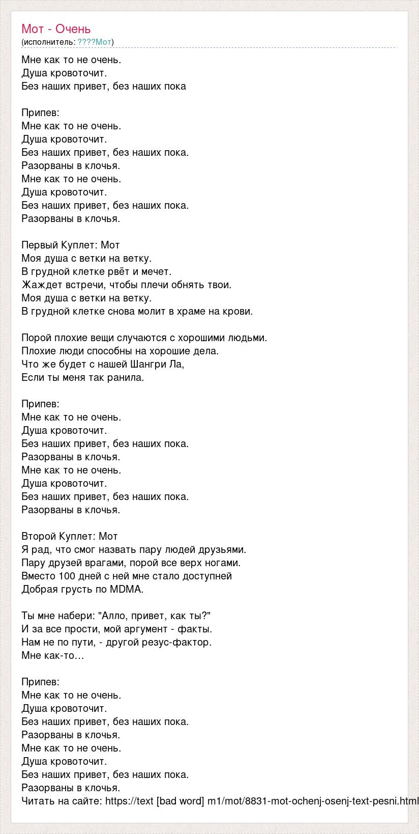 Мне как то не очень. Душа кровоточит. Без наших привет, без наших пока Припев: Мне как то не очень. Душа кровоточит. Без наших привет, без наших пока. Разорваны в клочья. Мне как то не очень. Душа кровоточит. Без наших привет, без наших пока. Разорваны в клочья. Первый Куплет: Мот Моя душа с ветки на ветку. В грудной клетке рвёт и мечет. Жаждет встречи, чтобы плечи обнять твои. Моя душа с ветки на ветку. В грудной клетке снова молит в храме на крови. Порой плохие вещи случаются с хорошими людьми. Плохие люди способны на хорошие дела. Что же будет с нашей Шангри Ла, Если ты меня так ранила. Припев: Мне как то не очень. Душа кровоточит. Без наших привет, без наших пока. Разорваны в клочья. Мне как то не очень. Душа кровоточит. Без наших привет, без наших пока. Разорваны в клочья. Второй Куплет: Мот Я рад, что смог назвать пару людей друзьями. Пару друзей врагами, порой все верх ногами. Вместо 100 дней с ней мне стало доступней Добрая грусть по MDMA. Ты мне набери: "Алло, привет, как ты?" И за все прости, мой аргумент - факты. Нам не по пути, - другой резус-фактор. Мне как-то… Припев: Мне как то не очень. Душа кровоточит. Без наших привет, без наших пока. Разорваны в клочья. Мне как то не очень. Душа кровоточит. Без наших привет, без наших пока. Разорваны в клочья. Читать на сайте: https://text [bad word] m1/mot/8831-mot-ochenj-osenj-text-pesni.html