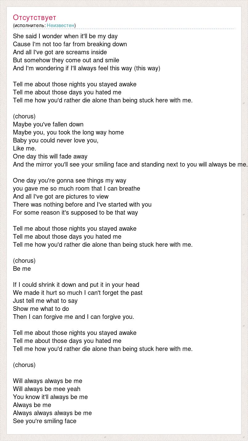 She said I wonder when it'll be my day Cause I'm not too far from breaking down And all I've got are screams inside But somehow they come out and smile And I'm wondering if I'll always feel this way (this way) Tell me about those nights you stayed awake Tell me about those days you hated me Tell me how you'd rather die alone than being stuck here with me. (chorus) Maybe you've fallen down Maybe you, you took the long way home Baby you could never love you, Like me. One day this will fade away And the mirror you'll see your smiling face and standing next to you will always be me. One day you're gonna see things my way you gave me so much room that I can breathe And all I've got are pictures to view There was nothing before and I've started with you For some reason it's supposed to be that way Tell me about those nights you stayed awake Tell me about those days you hated me Tell me how you'd rather die alone than being stuck here with me. (chorus) Be me If I could shrink it down and put it in your head We made it hurt so much I can't forget the past Just tell me what to say Show me what to do Then I can forgive me and I can forgive you. Tell me about those nights you stayed awake Tell me about those days you hated me Tell me how you'd rather die alone than being stuck here with me. (chorus) Will always always be me Will always be mee yeah You know it'll always be me Always be me Always always always be me See you're smiling face