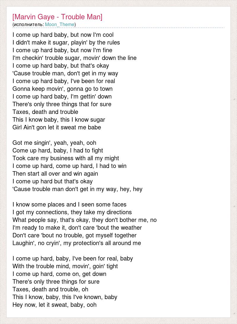 I come up hard baby, but now I'm cool I didn't make it sugar, playin' by the rules I come up hard baby, but now I'm fine I'm checkin' trouble sugar, movin' down the line I come up hard baby, but that's okay 'Cause trouble man, don't get in my way I come up hard baby, I've been for real Gonna keep movin', gonna go to town I come up hard baby, I'm gettin' down There's only three things that for sure Taxes, death and trouble This I know baby, this I know sugar Girl Ain't gon let it sweat me babe Got me singin', yeah, yeah, ooh Come up hard, baby, I had to fight Took care my business with all my might I come up hard, come up hard, I had to win Then start all over and win again I come up hard but that's okay 'Cause trouble man don't get in my way, hey, hey I know some places and I seen some faces I got my connections, they take my directions What people say, that's okay, they don't bother me, no I'm ready to make it, don't care 'bout the weather Don't care 'bout no trouble, got myself together Laughin', no cryin', my protection's all around me I come up hard, baby, I've been for real, baby With the trouble mind, movin', goin' tight I come up hard, come on, get down There's only three things for sure Taxes, death and trouble, oh This I know, baby, this I've known, baby Hey now, let it sweat, baby, ooh