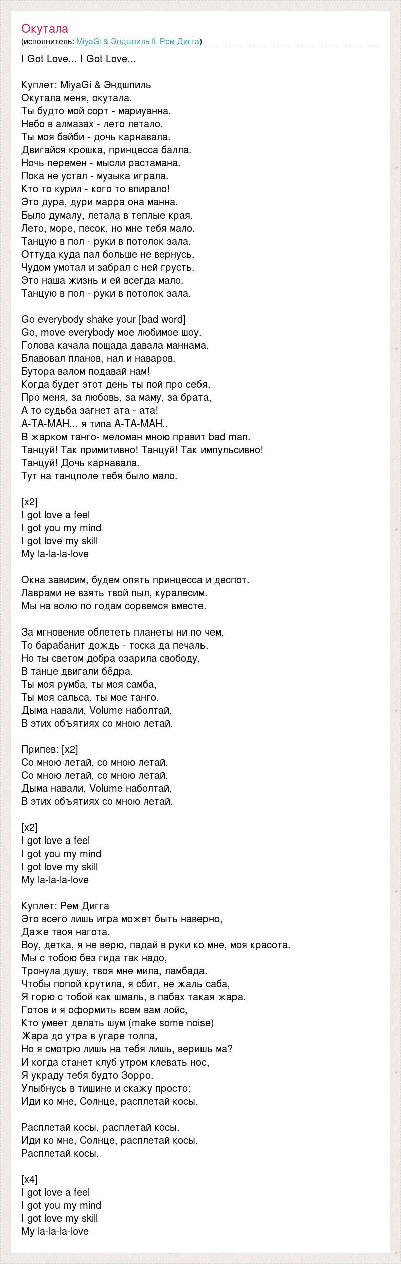 I Got Love... I Got Love... Куплет: MiyaGi & Эндшпиль Окутала меня, окутала. Ты будто мой сорт - мариуанна. Небо в алмазах - лето летало. Ты моя бэйби - дочь карнавала. Двигайся крошка, принцесса балла. Ночь перемен - мысли растамана. Пока не устал - музыка играла. Кто то курил - кого то впирало! Это дура, дури марра она манна. Было думалу, летала в теплые края. Лето, море, песок, но мне тебя мало. Танцую в пол - руки в потолок зала. Оттуда куда пал больше не вернусь. Чудом умотал и забрал с ней грусть. Это наша жизнь и ей всегда мало. Танцую в пол - руки в потолок зала. Go everybody shake your [bad word] Go, move everybody мое любимое шоу. Голова качала пощада давала маннама. Блавовал планов, нал и наваров. Бутора валом подавай нам! Когда будет этот день ты пой про себя. Про меня, за любовь, за маму, за брата, А то судьба загнет ата - ата! А-ТА-МАН... я типа А-ТА-МАН.. В жарком танго- меломан мною правит bad man. Танцуй! Так примитивно! Танцуй! Так импульсивно! Танцуй! Дочь карнавала. Тут на танцполе тебя было мало. [x2] I got love a feel I got you my mind I got love my skill My la-la-la-love Окна зависим, будем опять принцесса и деспот. Лаврами не взять твой пыл, куралесим. Мы на волю по годам сорвемся вместе. За мгновение облететь планеты ни по чем, То барабанит дождь - тоска да печаль. Но ты светом добра озарила свободу, В танце двигали бёдра. Ты моя румба, ты моя самба, Ты моя сальса, ты мое танго. Дыма навали, Volume наболтай, В этих объятиях со мною летай. Припев: [х2] Со мною летай, со мною летай. Со мною летай, со мною летай. Дыма навали, Volume наболтай, В этих объятиях со мною летай. [х2] I got love a feel I got you my mind I got love my skill My la-la-la-love Куплет: Рем Дигга Это всего лишь игра может быть наверно, Даже твоя нагота. Воу, детка, я не верю, падай в руки ко мне, моя красота. Мы с тобою без гида так надо, Тронула душу, твоя мне мила, ламбада. Чтобы попой крутила, я сбит, не жаль саба, Я горю с тобой как шмаль, в пабах такая жара. Готов и я оформить всем вам лойс, Кто умеет делать шум (make some noise) Жара до утра в угаре толпа, Но я смотрю лишь на тебя лишь, веришь ма? И когда станет клуб утром клевать нос, Я украду тебя будто Зорро. Улыбнусь в тишине и скажу просто: Иди ко мне, Солнце, расплетай косы. Расплетай косы, расплетай косы. Иди ко мне, Солнце, расплетай косы. Расплетай косы. [x4] I got love a feel I got you my mind I got love my skill My la-la-la-love