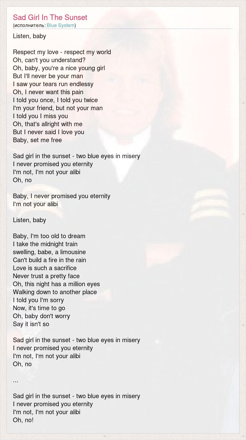 Listen, baby Respect my love - respect my world Oh, can't you understand? Oh, baby, you're a nice young girl But I'll never be your man I saw your tears run endlessy Oh, I never want this pain I told you once, I told you twice I'm your friend, but not your man I told you I miss you Oh, that's allright with me But I never said I love you Baby, set me free Sad girl in the sunset - two blue eyes in misery I never promised you eternity I'm not, I'm not your alibi Oh, no Baby, I never promised you eternity I'm not your alibi Listen, baby Baby, I'm too old to dream I take the midnight train swelling, babe, a limousine Can't build a fire in the rain Love is such a sacrifice Never trust a pretty face Oh, this night has a million eyes Walking down to another place I told you I'm sorry Now, it's time to go Oh, baby don't worry Say it isn't so Sad girl in the sunset - two blue eyes in misery I never promised you eternity I'm not, I'm not your alibi Oh, no ... Sad girl in the sunset - two blue eyes in misery I never promised you eternity I'm not, I'm not your alibi Oh, no!