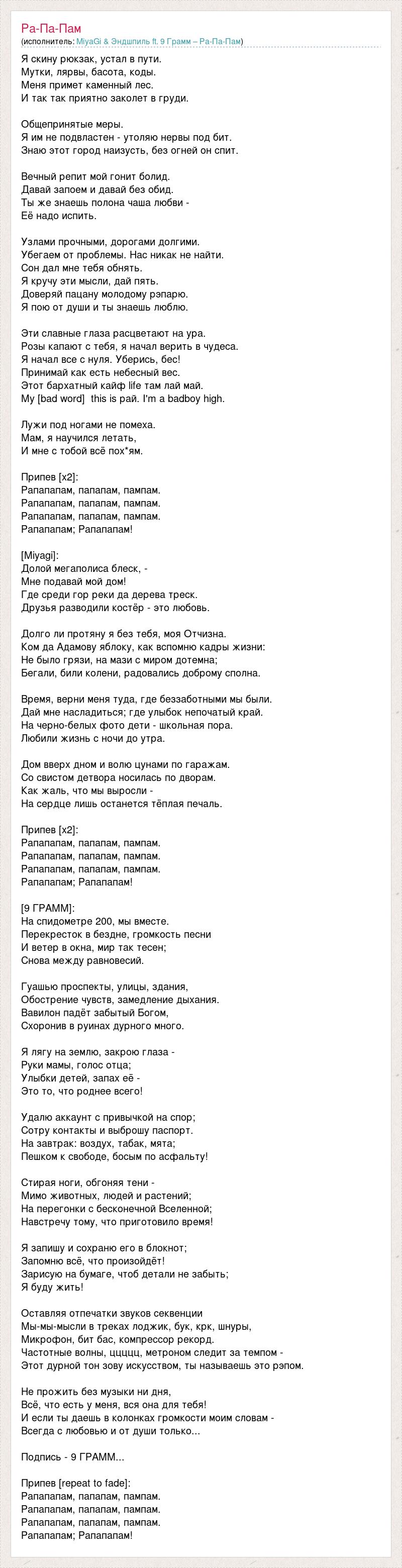 Я скину рюкзак, устал в пути. Мутки, лярвы, басота, коды. Меня примет каменный лес. И так так приятно заколет в груди. Общепринятые меры. Я им не подвластен - утоляю нервы под бит. Знаю этот город наизусть, без огней он спит. Вечный репит мой гонит болид. Давай запоем и давай без обид. Ты же знаешь полона чаша любви - Её надо испить. Узлами прочными, дорогами долгими. Убегаем от проблемы. Нас никак не найти. Сон дал мне тебя обнять. Я кручу эти мысли, дай пять. Доверяй пацану молодому рэпарю. Я пою от души и ты знаешь люблю. Эти славные глаза расцветают на ура. Розы капают с тебя, я начал верить в чудеса. Я начал все с нуля. Уберись, бес! Принимай как есть небесный вес. Этот бархатный кайф life там лай май. My [bad word] this is рай. I'm a badboy high. Лужи под ногами не помеха. Мам, я научился летать, И мне с тобой всё пох*ям. Припев [x2]: Рапапапам, папапам, пампам. Рапапапам, папапам, пампам. Рапапапам, папапам, пампам. Рапапапам; Рапапапам! [Miyagi]: Долой мегаполиса блеск, - Мне подавай мой дом! Где среди гор реки да дерева треск. Друзья разводили костёр - это любовь. Долго ли протяну я без тебя, моя Отчизна. Ком да Адамову яблоку, как вспомню кадры жизни: Не было грязи, на мази с миром дотемна; Бегали, били колени, радовались доброму сполна. Время, верни меня туда, где беззаботными мы были. Дай мне насладиться; где улыбок непочатый край. На черно-белых фото дети - школьная пора. Любили жизнь с ночи до утра. Дом вверх дном и волю цунами по гаражам. Со свистом детвора носилась по дворам. Как жаль, что мы выросли - На сердце лишь останется тёплая печаль. Припев [x2]: Рапапапам, папапам, пампам. Рапапапам, папапам, пампам. Рапапапам, папапам, пампам. Рапапапам; Рапапапам! [9 ГРАММ]: На спидометре 200, мы вместе. Перекресток в бездне, громкость песни И ветер в окна, мир так тесен; Снова между равновесий. Гуашью проспекты, улицы, здания, Обострение чувств, замедление дыхания. Вавилон падёт забытый Богом, Схоронив в руинах дурного много. Я лягу на землю, закрою глаза - Руки мамы, голос отца; Улыбки детей, запах её - Это то, что роднее всего! Удалю аккаунт с привычкой на спор; Сотру контакты и выброшу паспорт. На завтрак: воздух, табак, мята; Пешком к свободе, босым по асфальту! Стирая ноги, обгоняя тени - Мимо животных, людей и растений; На перегонки с бесконечной Вселенной; Навстречу тому, что приготовило время! Я запишу и сохраню его в блокнот; Запомню всё, что произойдёт! Зарисую на бумаге, чтоб детали не забыть; Я буду жить! Оставляя отпечатки звуков секвенции Мы-мы-мысли в треках лоджик, бук, крк, шнуры, Микрофон, бит бас, компрессор рекорд. Частотные волны, ццццц, метроном следит за темпом - Этот дурной тон зову искусством, ты называешь это рэпом. Не прожить без музыки ни дня, Всё, что есть у меня, вся она для тебя! И если ты даешь в колонках громкости моим словам - Всегда с любовью и от души только... Подпись - 9 ГРАММ... Припев [repeat to fade]: Рапапапам, папапам, пампам. Рапапапам, папапам, пампам. Рапапапам, папапам, пампам. Рапапапам; Рапапапам!