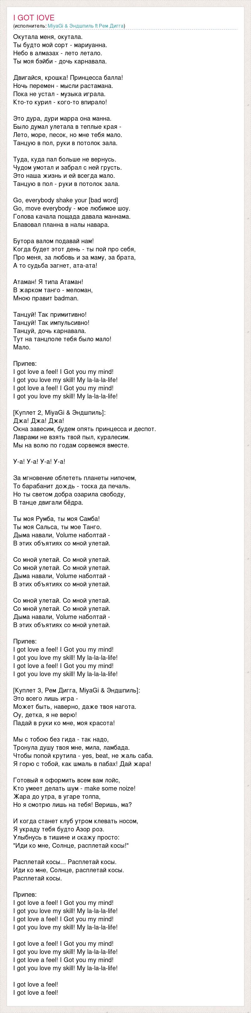 Окутала меня, окутала. Ты будто мой сорт - мариуанна. Небо в алмазах - лето летало. Ты моя бэйби - дочь карнавала. Двигайся, крошка! Принцесса балла! Ночь перемен - мысли растамана. Пока не устал - музыка играла. Кто-то курил - кого-то впирало! Это дура, дури марра она манна. Было думал улетала в теплые края - Лето, море, песок, но мне тебя мало. Танцую в пол, руки в потолок зала. Туда, куда пал больше не вернусь. Чудом умотал и забрал с ней грусть. Это наша жизнь и ей всегда мало. Танцую в пол - руки в потолок зала. Go, everybody shake your [bad word] Go, move everybody - мое любимое шоу. Голова качала пощада давала маннама. Блавовал планна в налы навара. Бутора валом подавай нам! Когда будет этот день - ты пой про себя, Про меня, за любовь и за маму, за брата, А то судьба загнет, ата-ата! Атаман! Я типа Атаман! В жарком танго - меломан, Мною правит badman. Танцуй! Так примитивно! Танцуй! Так импульсивно! Танцуй, дочь карнавала. Тут на танцполе тебя было мало! Мало. Припев: I got love a feel! I Got you my mind! I got you love my skill! My la-la-la-life! I got love a feel! I Got you my mind! I got you love my skill! My la-la-la-life! [Куплет 2, MiyaGi & Эндшпиль]: Джа! Джа! Джа! Окна завесим, будем опять принцесса и деспот. Лаврами не взять твой пыл, куралесим. Мы на волю по годам сорвемся вместе. У-а! У-а! У-а! У-а! За мгновение облететь планеты нипочем, То барабанит дождь - тоска да печаль. Но ты светом добра озарила свободу, В танце двигали бёдра. Ты моя Румба, ты моя Самба! Ты моя Сальса, ты мое Танго. Дыма навали, Volume наболтай - В этих объятиях со мной улетай. Со мной улетай. Со мной улетай. Со мной улетай. Со мной улетай. Дыма навали, Volume наболтай - В этих объятиях со мной улетай. Со мной улетай. Со мной улетай. Со мной улетай. Со мной улетай. Дыма навали, Volume наболтай - В этих объятиях со мной улетай. Припев: I got love a feel! I Got you my mind! I got you love my skill! My la-la-la-life! I got love a feel! I Got you my mind! I got you love my skill! My la-la-la-life! [Куплет 3, Рем Дигга, MiyaGi & Эндшпиль]: Это всего лишь игра - Может быть, наверно, даже твоя нагота. Оу, детка, я не верю! Падай в руки ко мне, моя красота! Мы с тобою без гида - так надо, Тронула душу твоя мне, мила, ламбада. Чтобы попой крутила - yes, beat, не жаль саба. Я горю с тобой, как шмаль в пабах! Дай жара! Готовый я оформить всем вам лойс, Кто умеет делать шум - make some noize! Жара до утра, в угаре толпа, Но я смотрю лишь на тебя! Веришь, ма? И когда станет клуб утром клевать носом, Я украду тебя будто Азор роз. Улыбнусь в тишине и скажу просто: "Иди ко мне, Солнце, расплетай косы!" Расплетай косы... Расплетай косы. Иди ко мне, Солнце, расплетай косы. Расплетай косы. Припев: I got love a feel! I Got you my mind! I got you love my skill! My la-la-la-life! I got love a feel! I Got you my mind! I got you love my skill! My la-la-la-life! I got love a feel! I Got you my mind! I got you love my skill! My la-la-la-life! I got love a feel! I Got you my mind! I got you love my skill! My la-la-la-life! I got love a feel! I got love a feel!