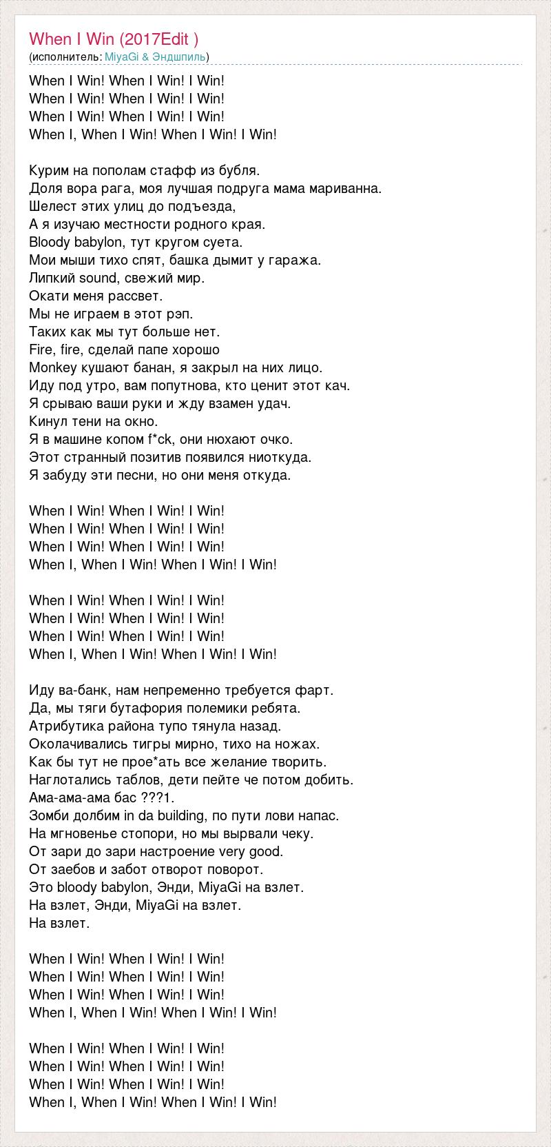 When I Win! When I Win! I Win! When I Win! When I Win! I Win! When I Win! When I Win! I Win! When I, When I Win! When I Win! I Win! Курим на пополам стафф из бубля. Доля вора рага, моя лучшая подруга мама мариванна. Шелест этих улиц до подъезда, А я изучаю местности родного края. Bloody babylon, тут кругом суета. Мои мыши тихо спят, башка дымит у гаража. Липкий sound, свежий мир. Окати меня рассвет. Мы не играем в этот рэп. Таких как мы тут больше нет. Fire, fire, сделай папе хорошо Monkey кушают банан, я закрыл на них лицо. Иду под утро, вам попутнова, кто ценит этот кач. Я срываю ваши руки и жду взамен удач. Кинул тени на окно. Я в машине копом f*ck, они нюхают очко. Этот странный позитив появился ниоткуда. Я забуду эти песни, но они меня откуда. When I Win! When I Win! I Win! When I Win! When I Win! I Win! When I Win! When I Win! I Win! When I, When I Win! When I Win! I Win! When I Win! When I Win! I Win! When I Win! When I Win! I Win! When I Win! When I Win! I Win! When I, When I Win! When I Win! I Win! Иду ва-банк, нам непременно требуется фарт. Да, мы тяги бутафория полемики ребята. Атрибутика района тупо тянула назад. Околачивались тигры мирно, тихо на ножах. Как бы тут не прое*ать все желание творить. Наглотались таблов, дети пейте че потом добить. Ама-ама-ама бас ???1. Зомби долбим in da building, по пути лови напас. На мгновенье стопори, но мы вырвали чеку. От зари до зари настроение very good. От заебов и забот отворот поворот. Это bloody babylon, Энди, MiyaGi на взлет. На взлет, Энди, MiyaGi на взлет. На взлет. When I Win! When I Win! I Win! When I Win! When I Win! I Win! When I Win! When I Win! I Win! When I, When I Win! When I Win! I Win! When I Win! When I Win! I Win! When I Win! When I Win! I Win! When I Win! When I Win! I Win! When I, When I Win! When I Win! I Win!