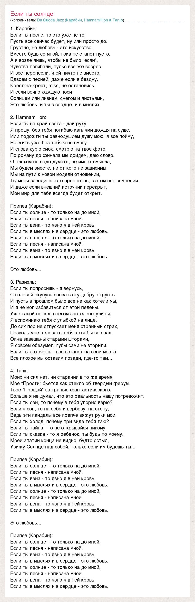 1. Карабин: Если ты после, то это уже не то, Пусть все сейчас будет, ну или просто до. Грустно, но любовь - это искусство, Вместе будь со мной, пока не станет пусто. А я возле лишь, чтобы не было "если", Чувства погибали, пульс все же восрес. И все перенесли, и ей ничто не вместо, Вдвоем с песней, даже если в бездну. Крест-на-крест, miss, не остановись, И если вечно каждую носит Солнцем или ливнем, снегом и листьями, Это любовь, и ты в сердце, и в мыслях. 2. Hamnamillion: Если ты на край света - дай руку, Я прошу, без тебя погибаю каплями дождя на суше, Или подожги ты равнодушием душу мою, я все пойму, Но жить уже без тебя я не смогу. И снова курю смок, смотрю на твое фото, По роману до финала мы дойдем, даю слово. О плохом не надо думать, не имеет смысла, Мы будем вместе, ни от кого не зависимы. Мы на пути к новой модели отношении, Ты меня заводишь, сто процентов, в этом нет сомнении. И даже если внешний источник перекрыт, Мой мир для тебя всегда будет открыт. Припев (Карабин): Если ты солнце - то только на до мной, Если ты песня - написана мной. Если ты вена - то явно я в ней кровь, Если ты в мыслях и в сердце - это любовь. Если ты солнце - то только на до мной, Если ты песня - написана мной. Если ты вена - то явно я в ней кровь, Если ты в мыслях и в сердце - это любовь. Это любовь... 3. Разиэль: Если ты попросишь - я вернусь, С головой окунусь снова в эту добрую грусть. И пусть в прошлом было все не как хотели мы, И я не мог избавиться от этой пелены. Уже какой пошел, снегом застелены улицы, Я вспоминаю тебя с улыбкой на лице. До сих пор не отпускает меня странный страх, Позволь мне целовать тебя хотя бы во снах. Окна завешаны старыми шторами, Я совсем обезумел, губы сами не вторили. Если ты захочешь - все встанет на свои места, Все плохое мы оставим позади, где-то там... 4. Tanir: Моих ни сил нет, ни старании в то же время, Мое "Прости" бьется как стекло об твердый ферум. Твое "Прощай" за гранью фантастического, Больше я не думал, что это реальность нашу потревожит. Если ты сон, то почему в тебя упорно верю? Если я сон, то на себя и вербову, на стену, Ведь эти кандалы все крепче вяжут руки мои. Если ты холод, почему при виде тебя таю? Если ты тайна - то не открывайся никому, Если ты сказка - то я ребенок, ты будь по моему. Моей апатии конца не видно, будто остыл, Увижу Солнце над собой, только если им будешь ты... Припев (Карабин): Если ты солнце - то только на до мной, Если ты песня - написана мной. Если ты вена - то явно я в ней кровь, Если ты в мыслях и в сердце - это любовь. Если ты солнце - то только на до мной, Если ты песня - написана мной. Если ты вена - то явно я в ней кровь, Если ты в мыслях и в сердце - это любовь. Это любовь... Припев (Карабин): Если ты солнце - то только на до мной, Если ты песня - написана мной. Если ты вена - то явно я в ней кровь, Если ты в мыслях и в сердце - это любовь. Если ты солнце - то только на до мной, Если ты песня - написана мной. Если ты вена - то явно я в ней кровь, Если ты в мыслях и в сердце - это любовь.
